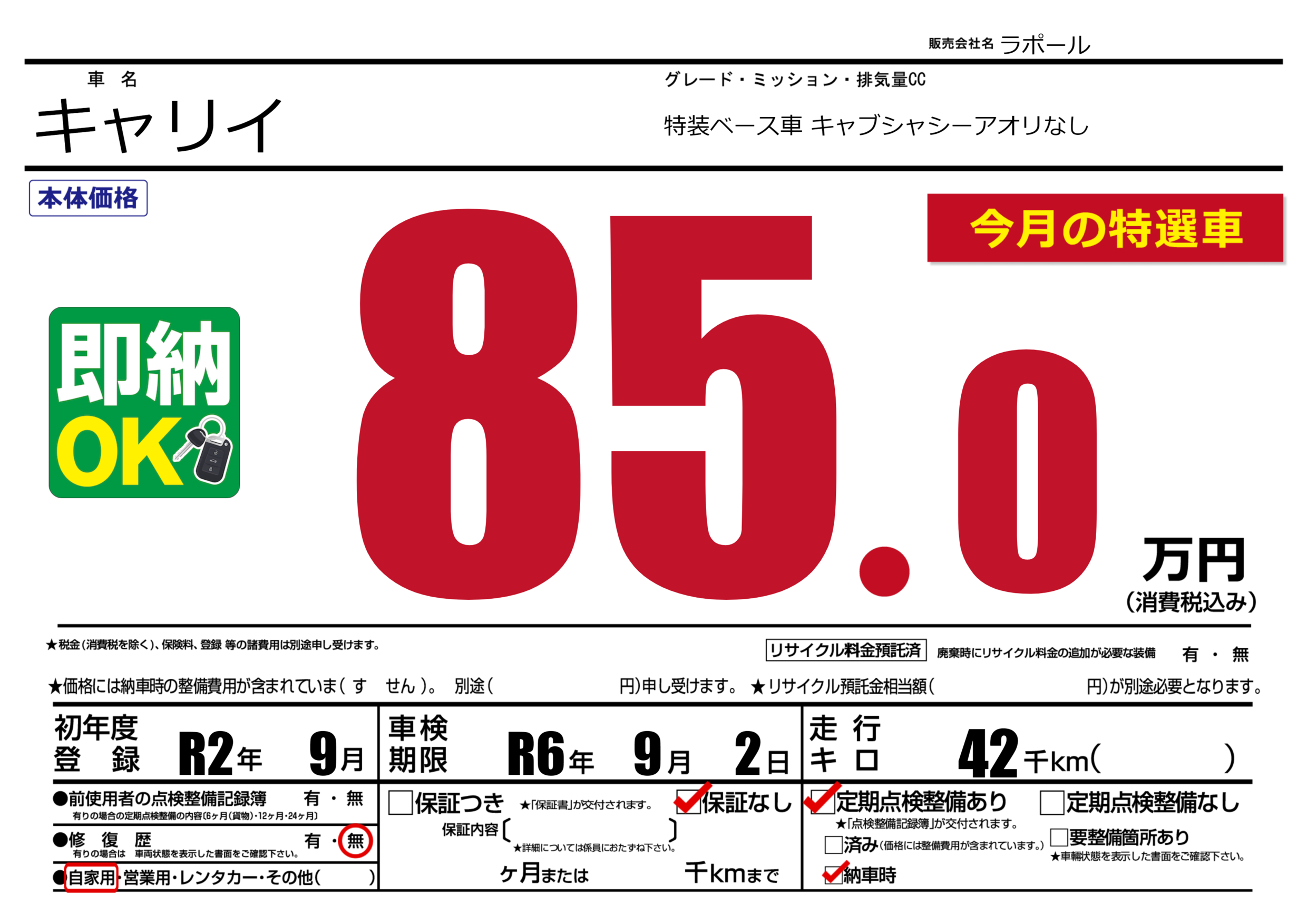 なし | 車検制限 | R6年9月2月 |