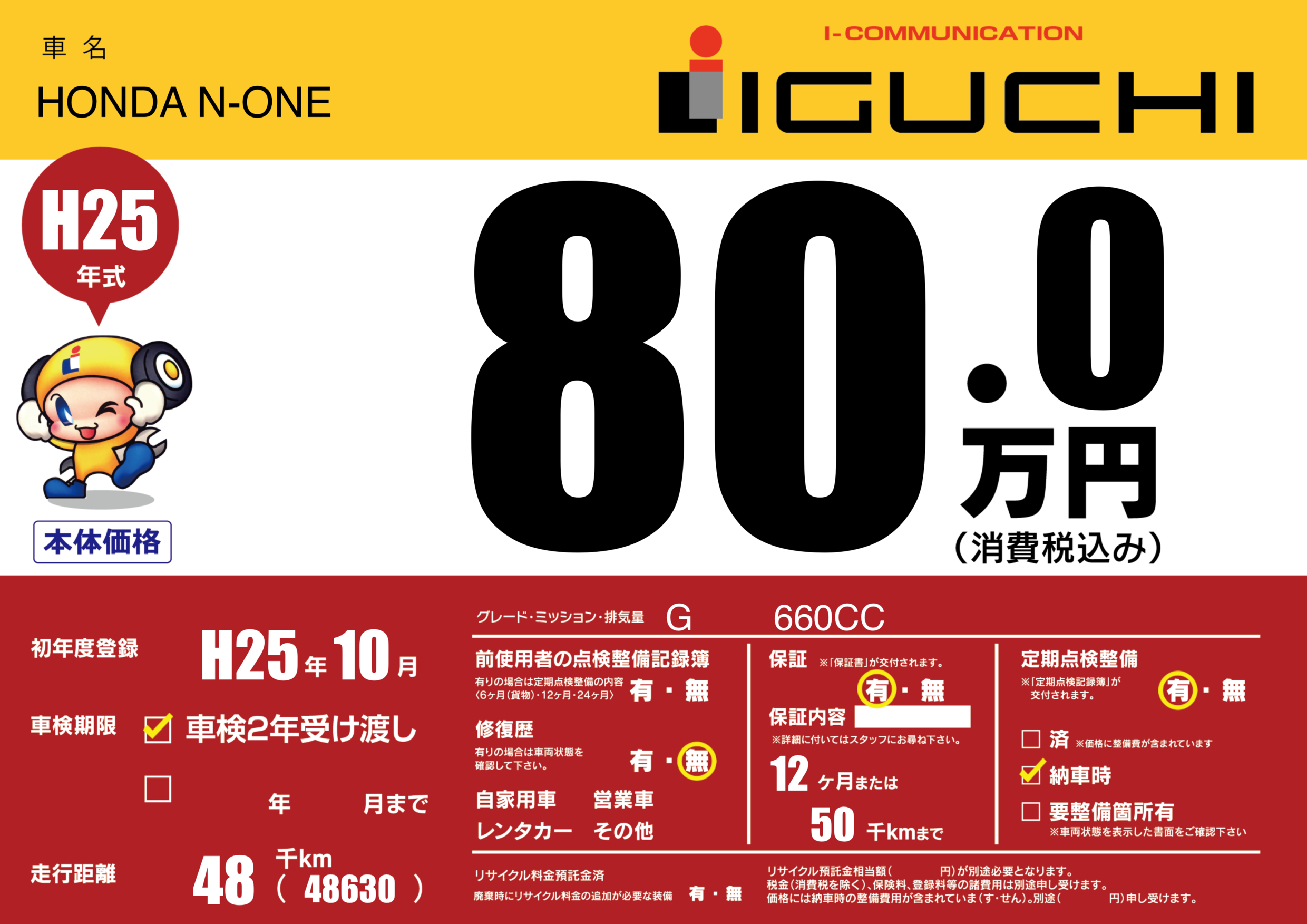 | 車名 | HONDA N-ONE | グレード ミッション 排気量 |