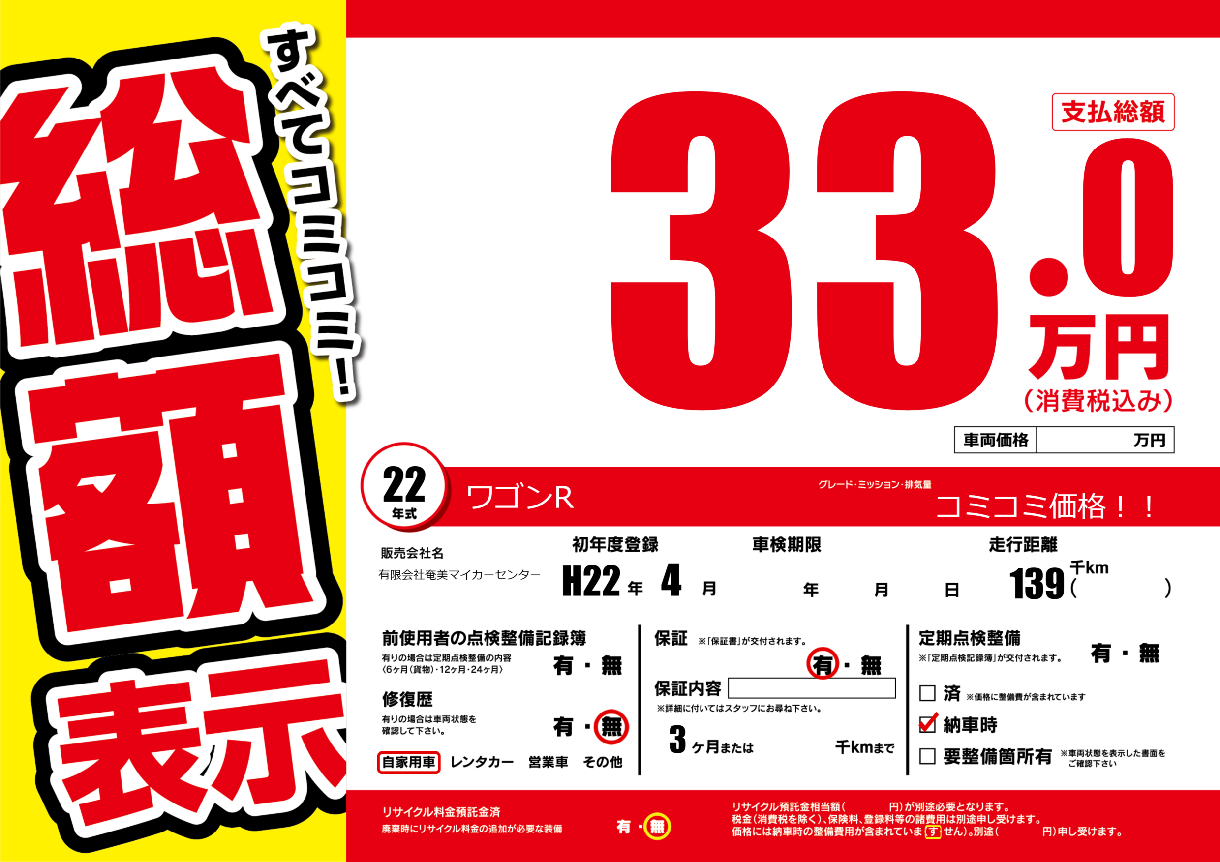 | 車名 | ワゴンR | グレード ミッション 排気量 |
