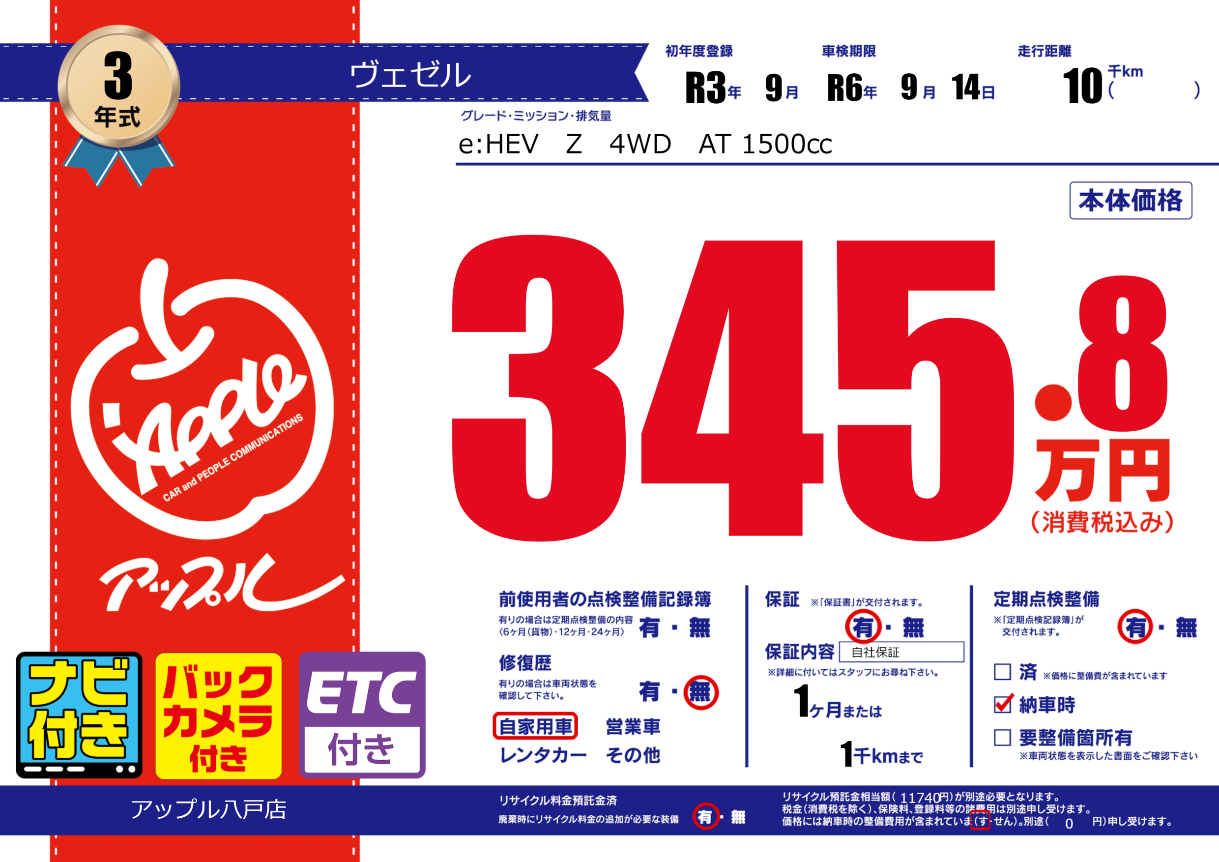 | 走行キロ | 1万km | 初年度登録 | R3年9月 |