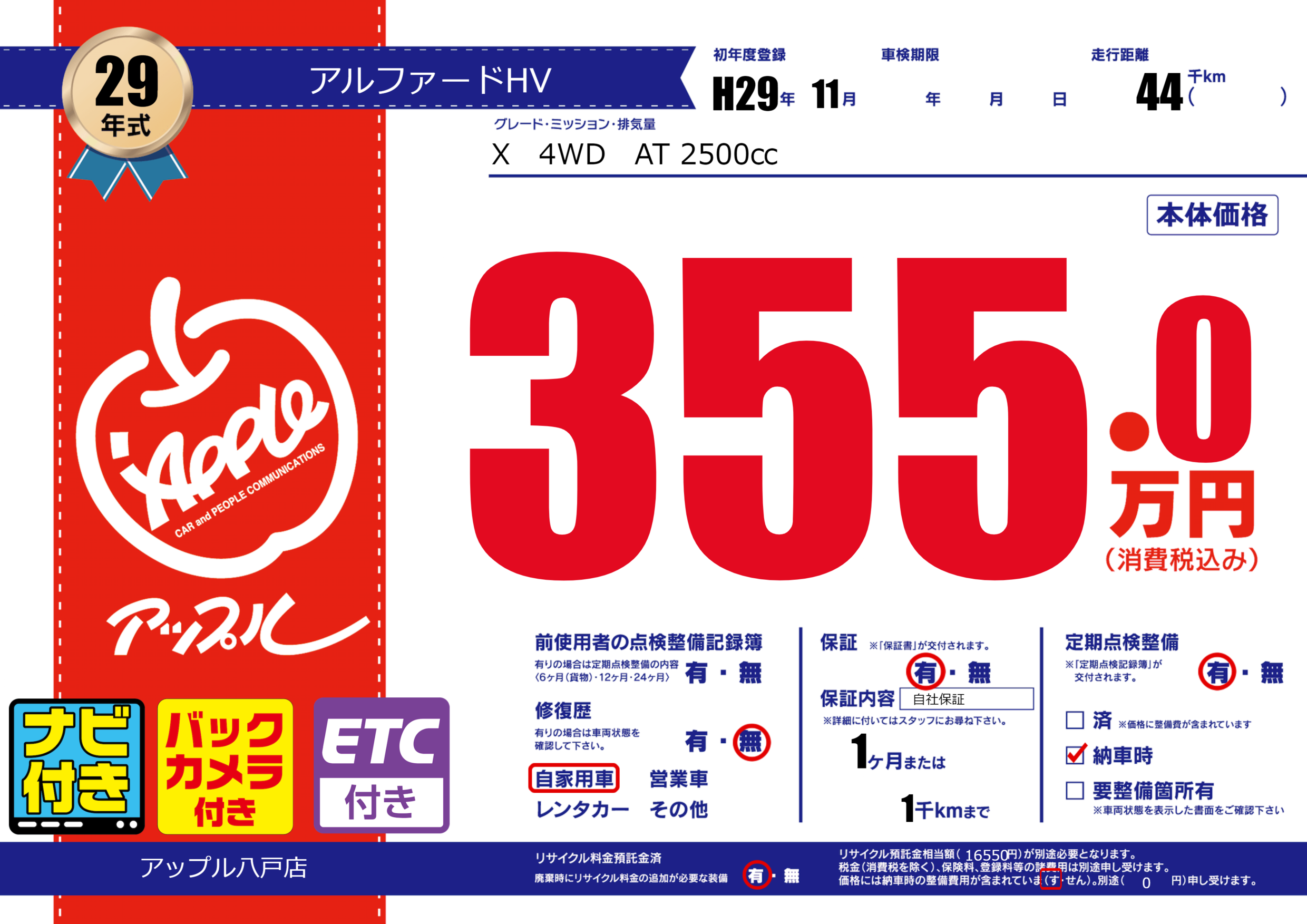保証付き 保証内容( 自社保証) 1ヶ月または(1)千kmまで |