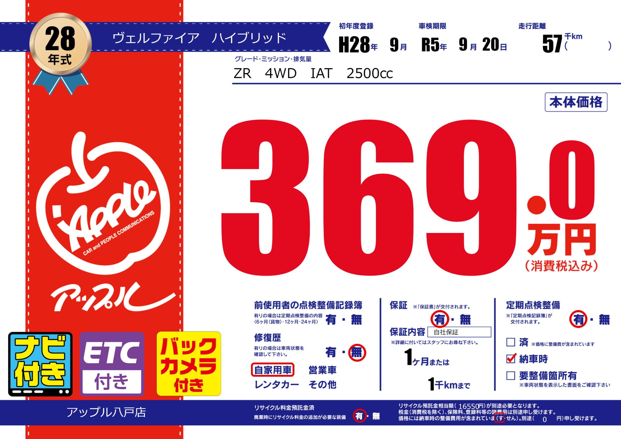 | 車名 | ヴェルファイア ハイブリッド | グレード ミッション 排気量 |