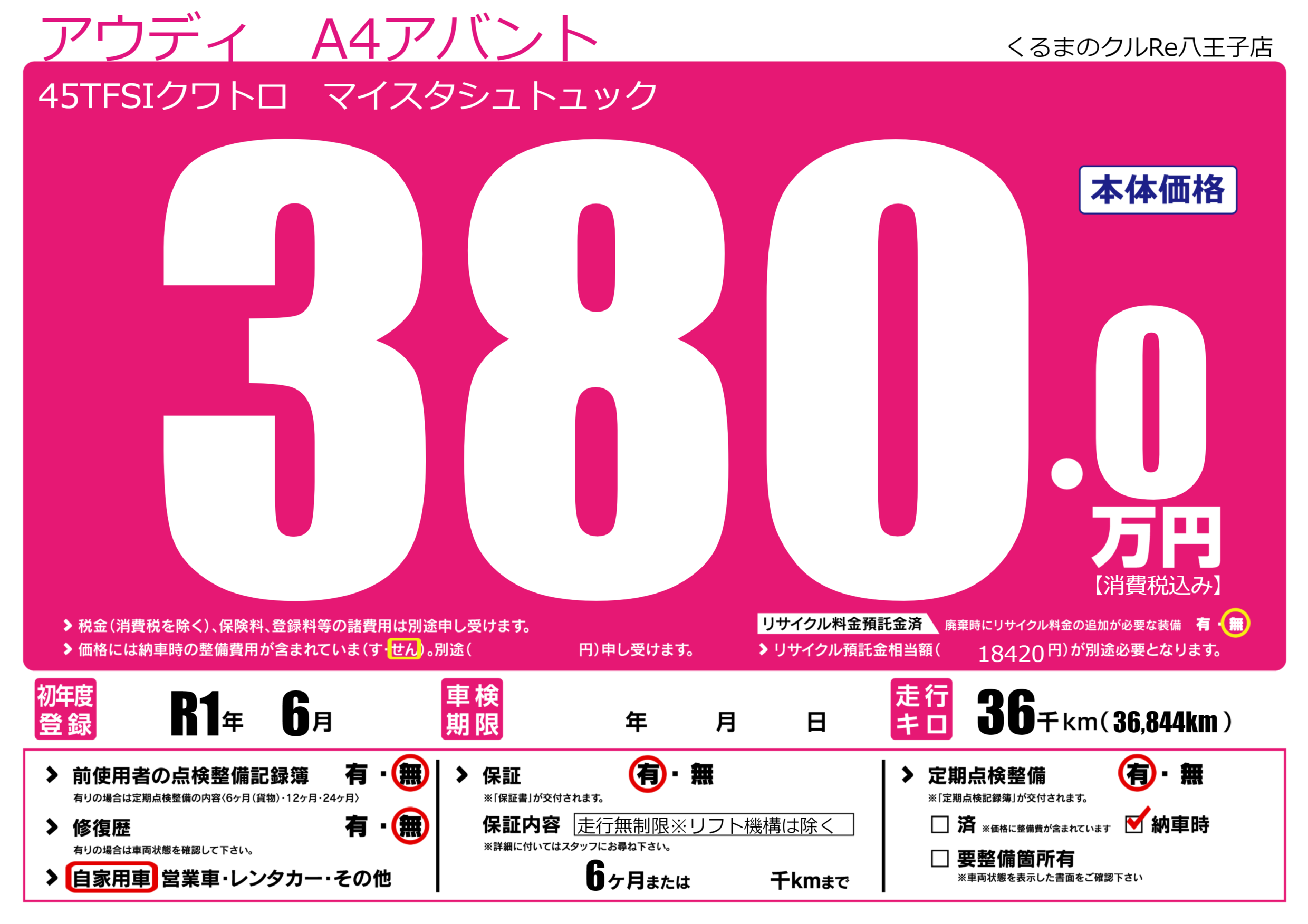 | 車名 | アウディ A4アバント | グレード ミッション 排気量 |