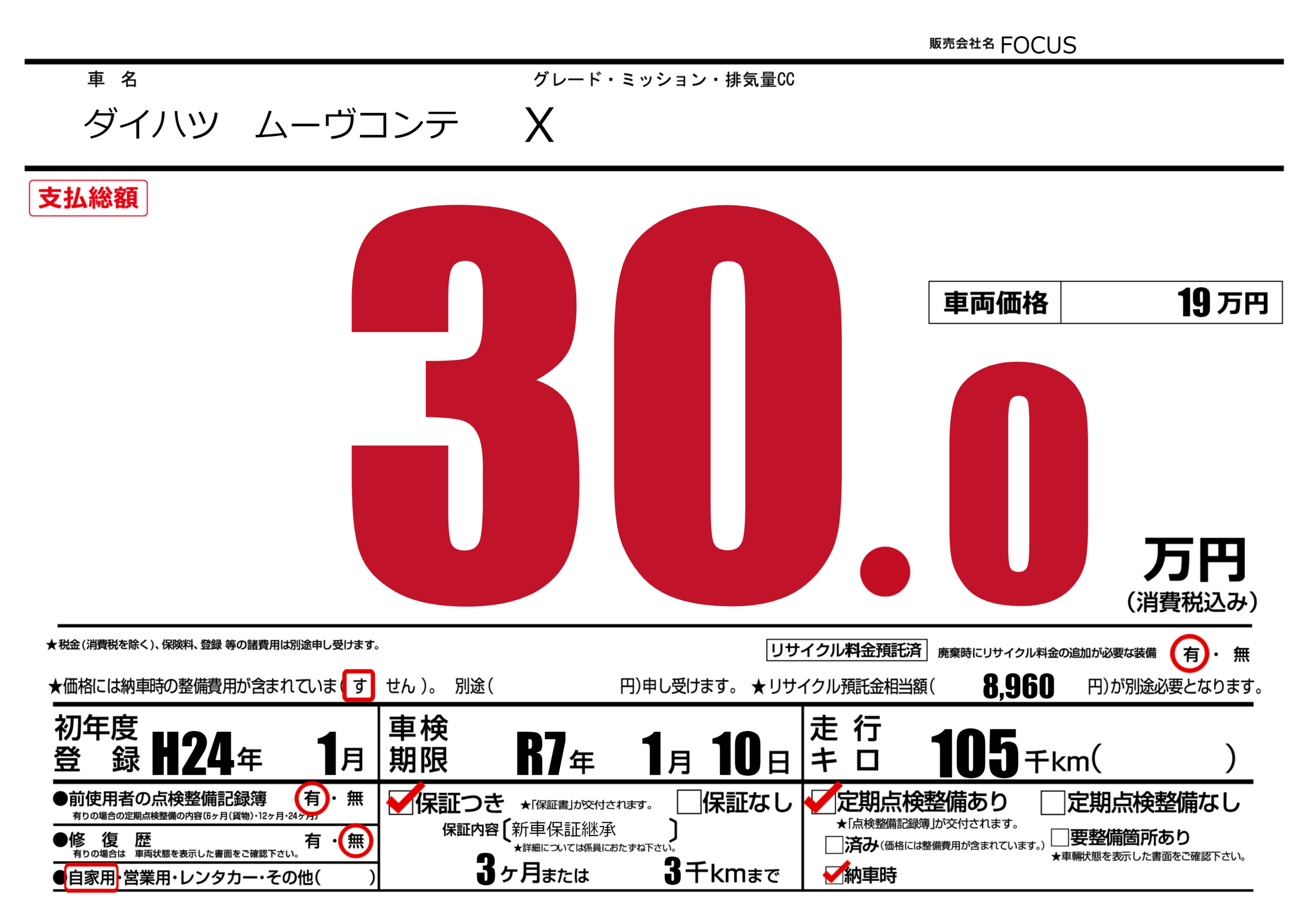 | 車名 | ダイハツ ムーヴコンテ | グレード ミッション 排気量 |