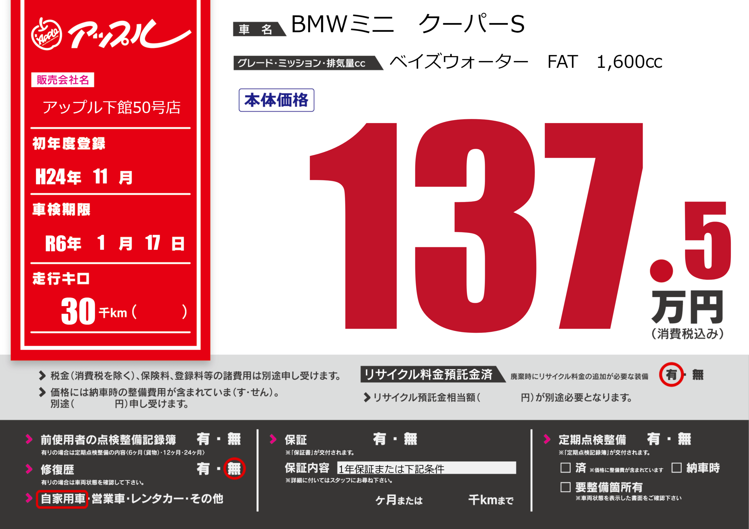 | 車名 | BMWミニ クーパーS | グレード ミッション 排気量 |