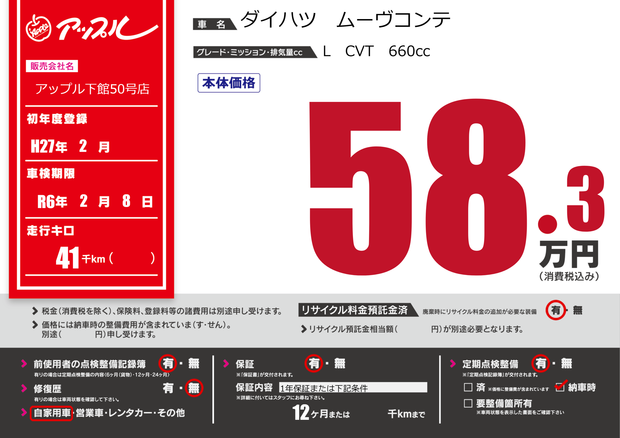 | 車名 | ダイハツ ムーヴコンテ | グレード ミッション 排気量 |