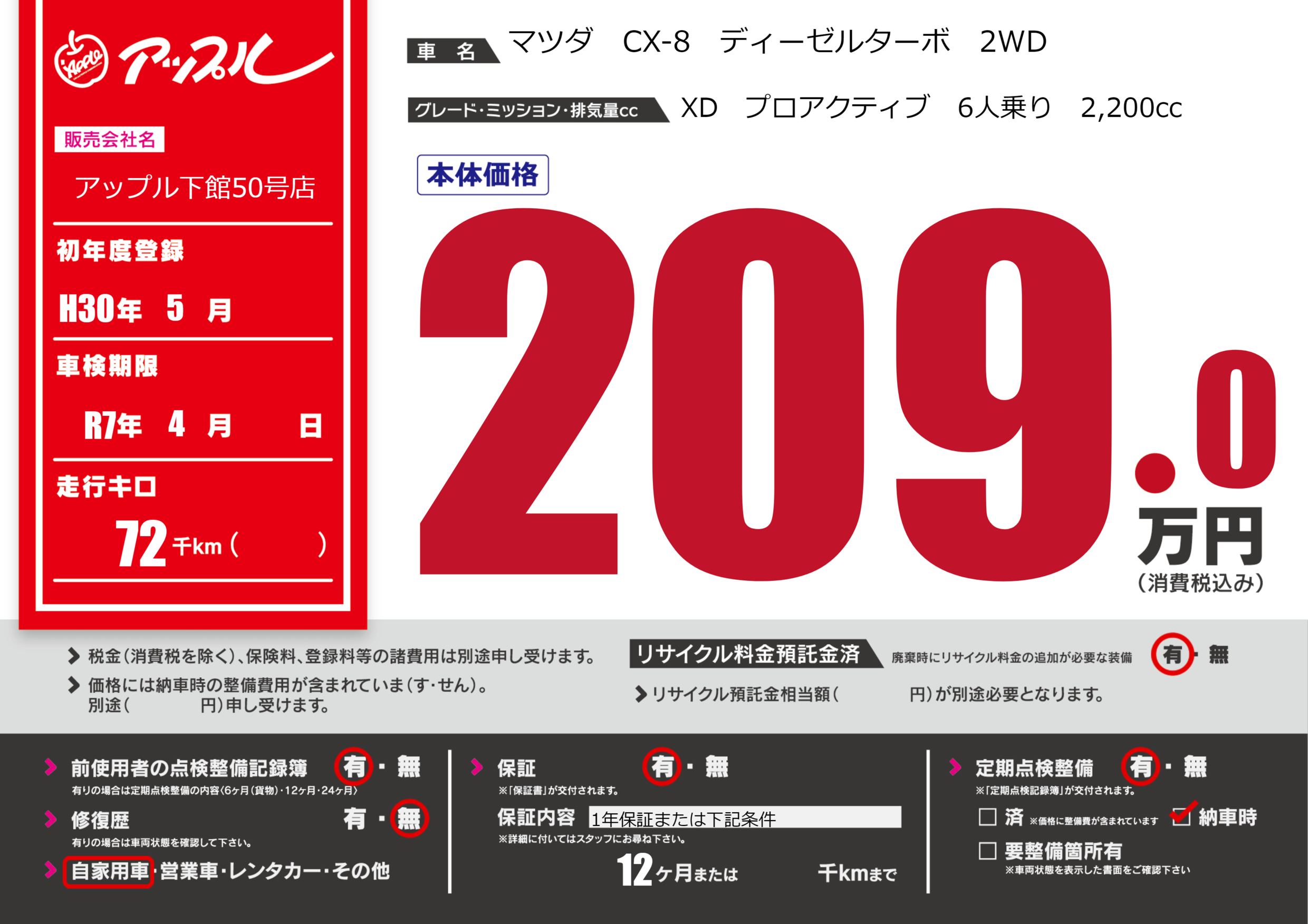 | 車名 | マツダ CX-8 ディーゼルターボ 2WD | グレード ミッション 排気量 |