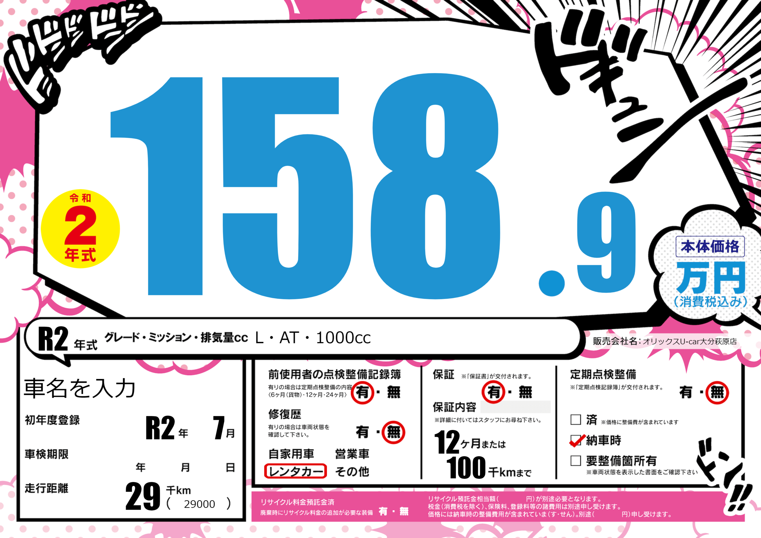 | 走行キロ | 2.9万km | 初年度登録 | R2年7月 |
