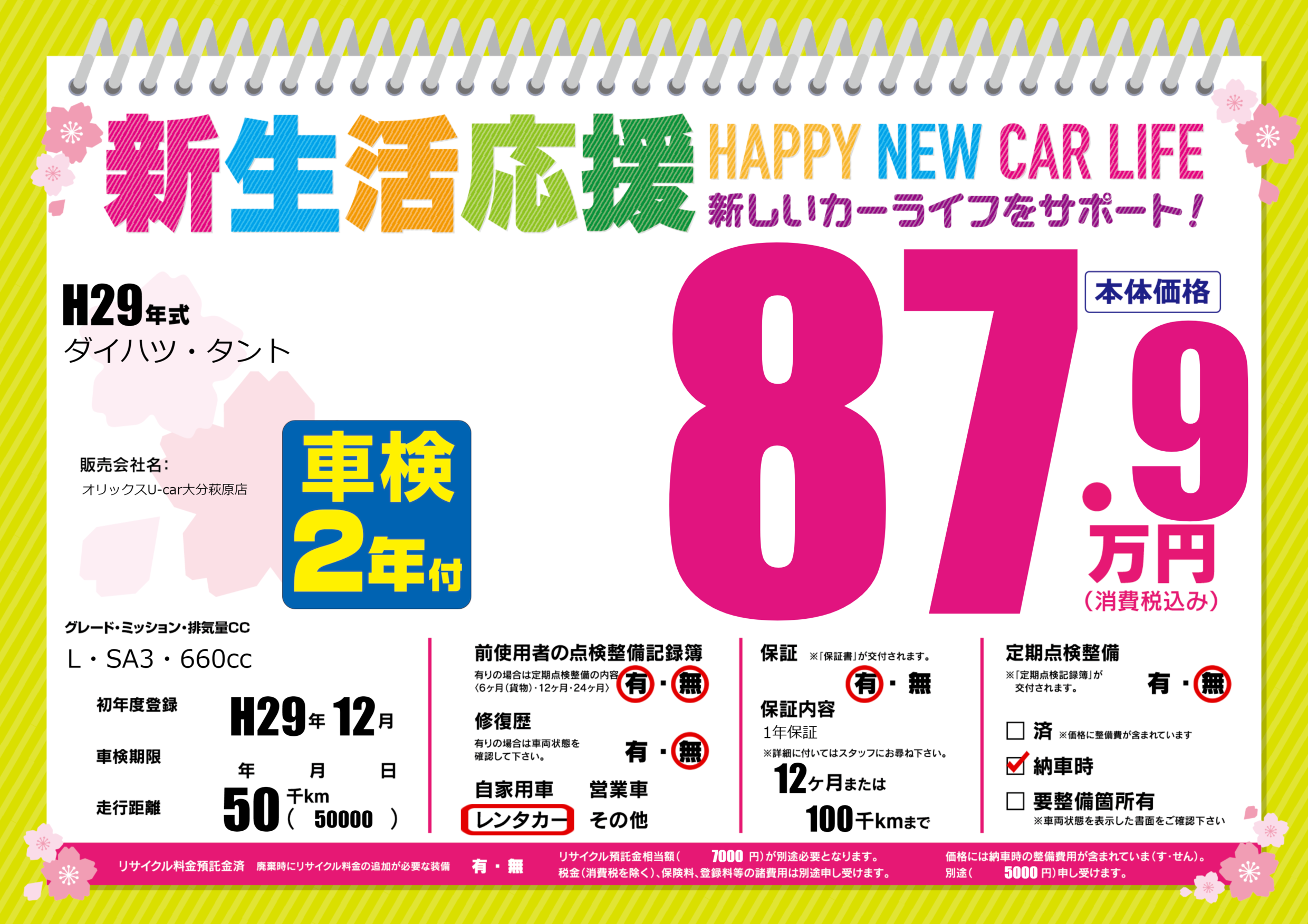| 車名 | ダイハツ・タント | グレード ミッション 排気量 |