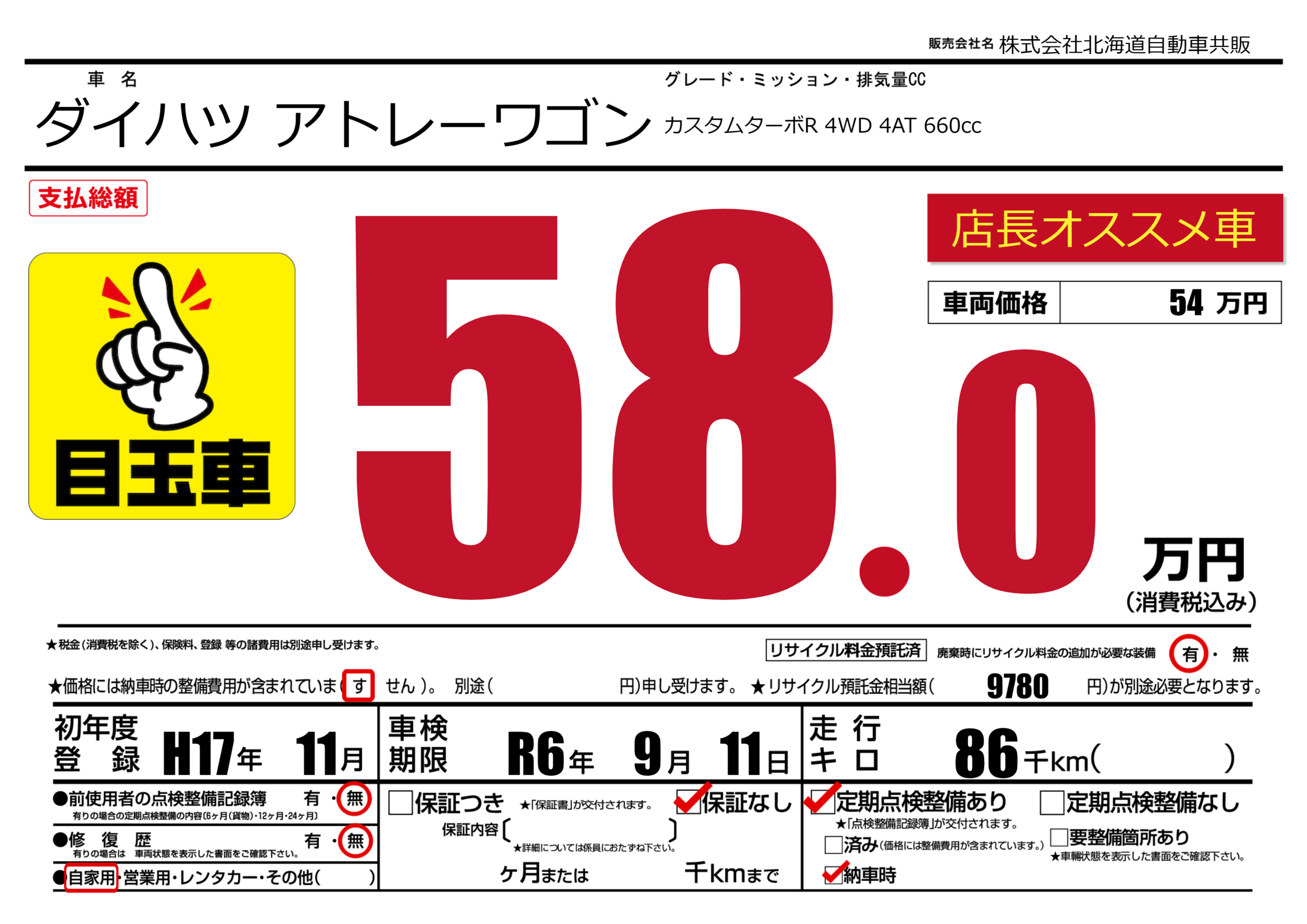 | 走行キロ | 8.6万km | 初年度登録 | H17年11月 |