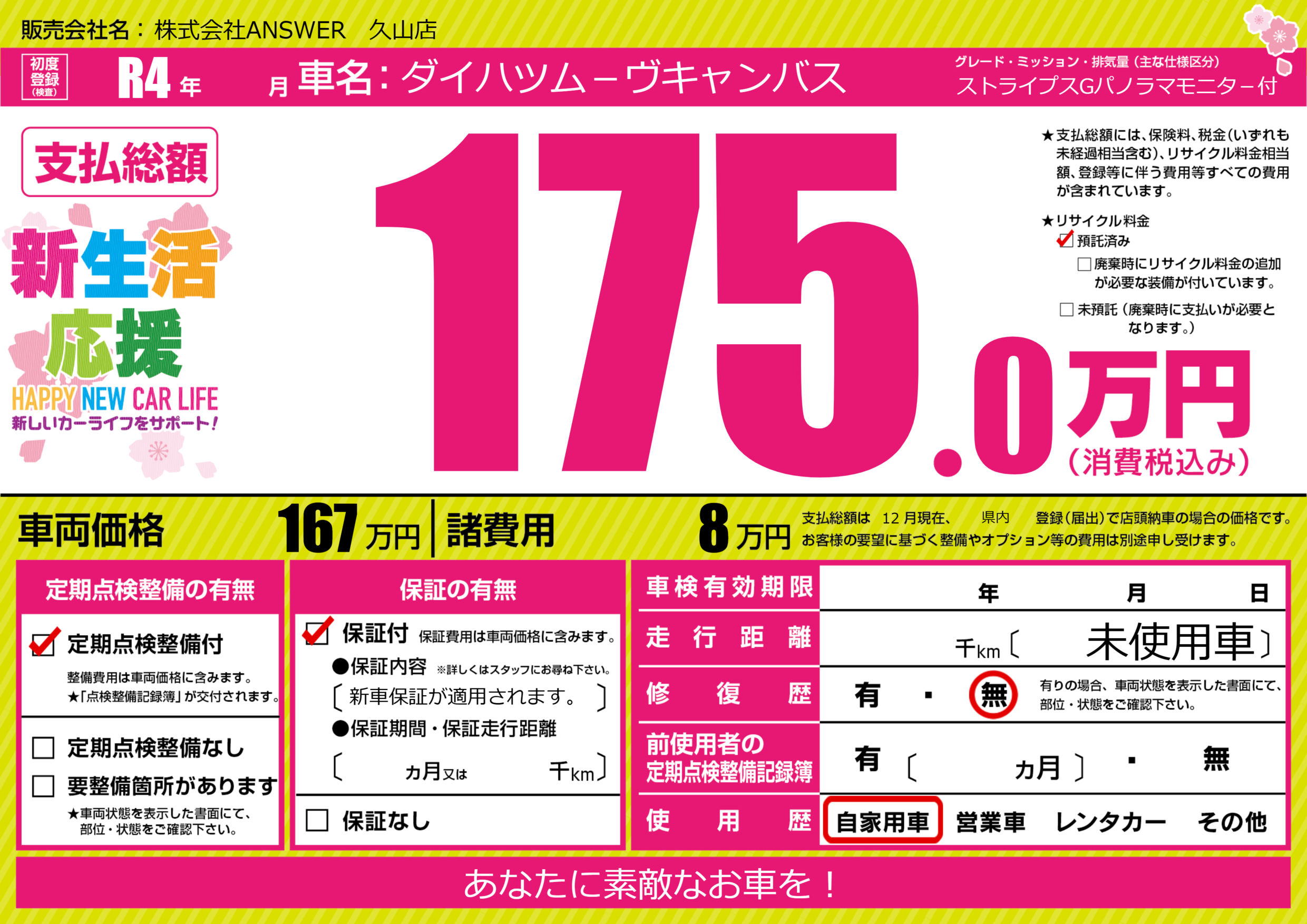 保証なし 保証内容(新車保証が適用されます。) ---ヶ月または()千kmまで |