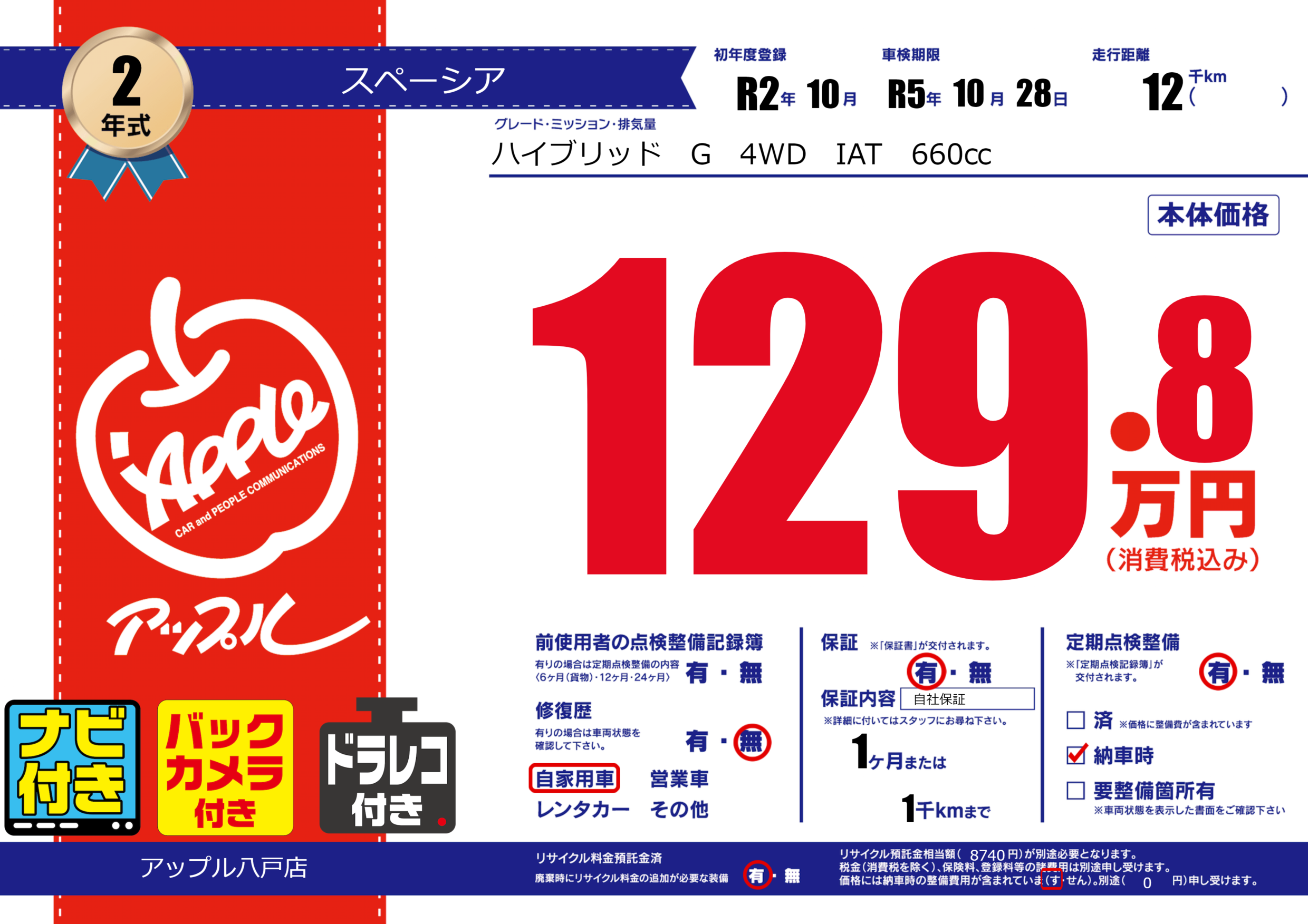 | 定期点検整備 | 定期点検整備あり 納車時あり | ||