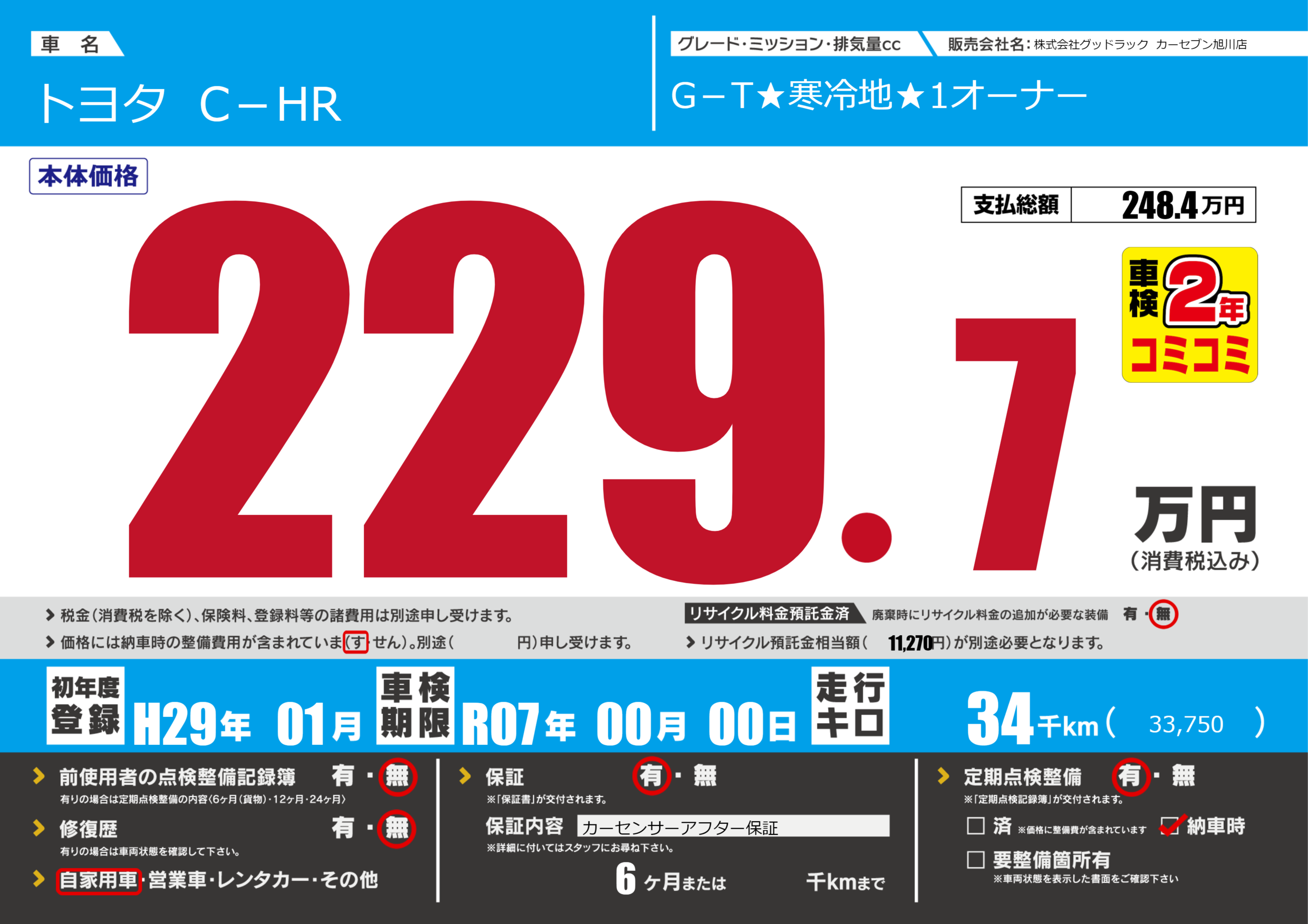 | 車名 | トヨタ C-HR | グレード ミッション 排気量 |