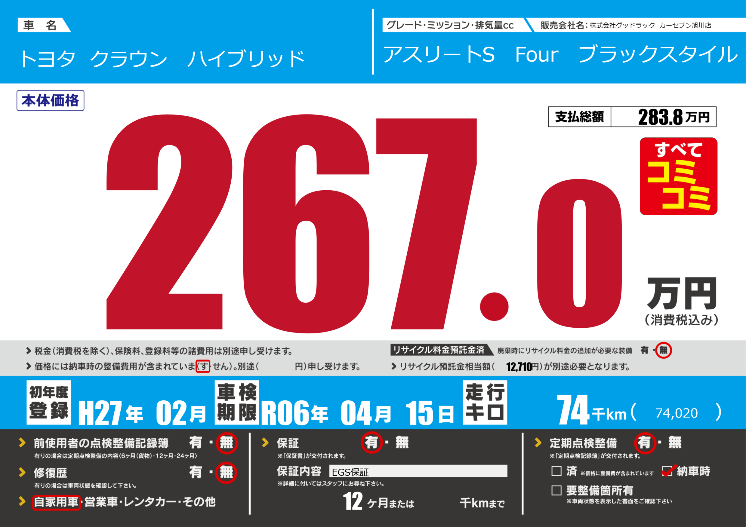 | 車名 | トヨタ クラウン ハイブリッド | グレード ミッション 排気量 |