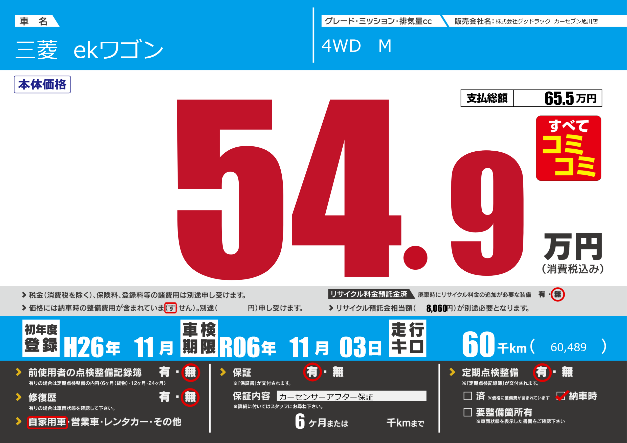 | 車名 | 三菱 ekワゴン | グレード ミッション 排気量 |