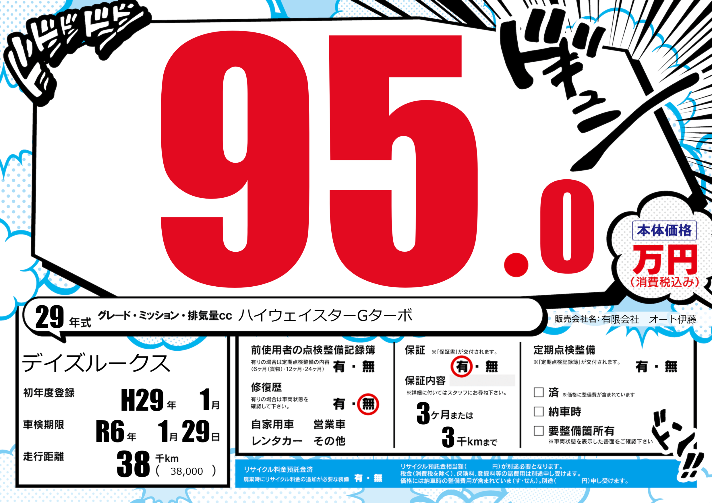 | 走行キロ | 3.8万km | 初年度登録 | H29年1月 |