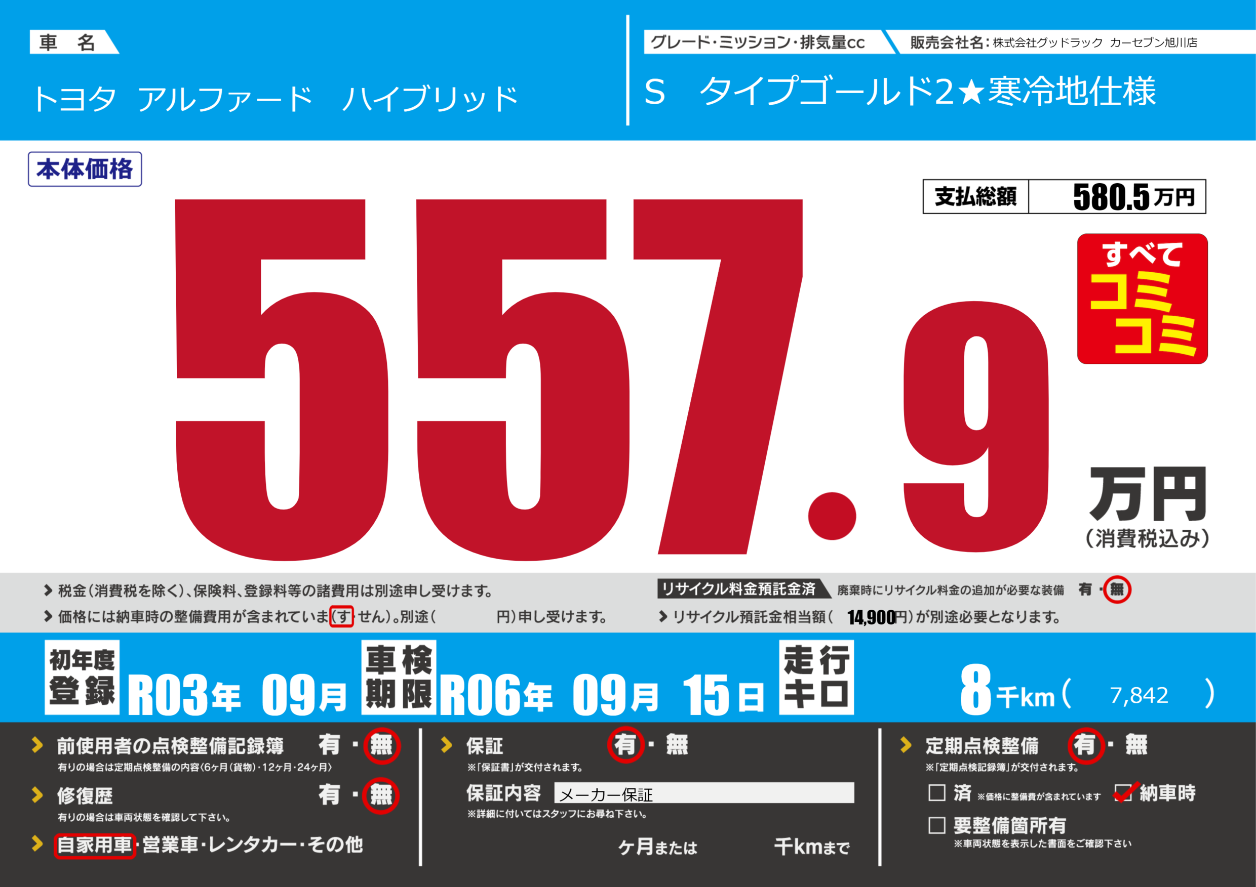 | 走行キロ | 0.8万km | 初年度登録 | R03年09月 |