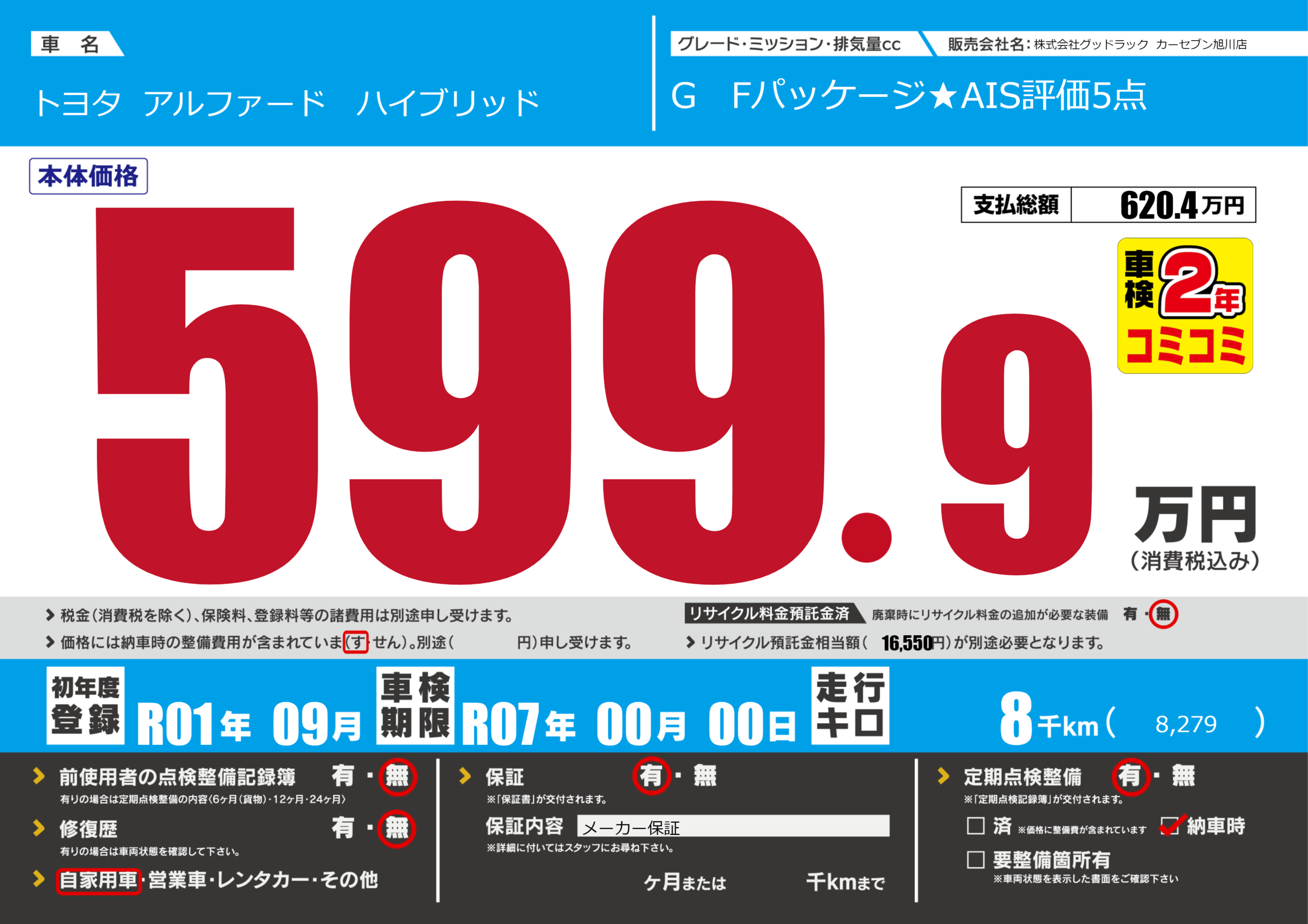 | 走行キロ | 0.8万km | 初年度登録 | R01年09月 |