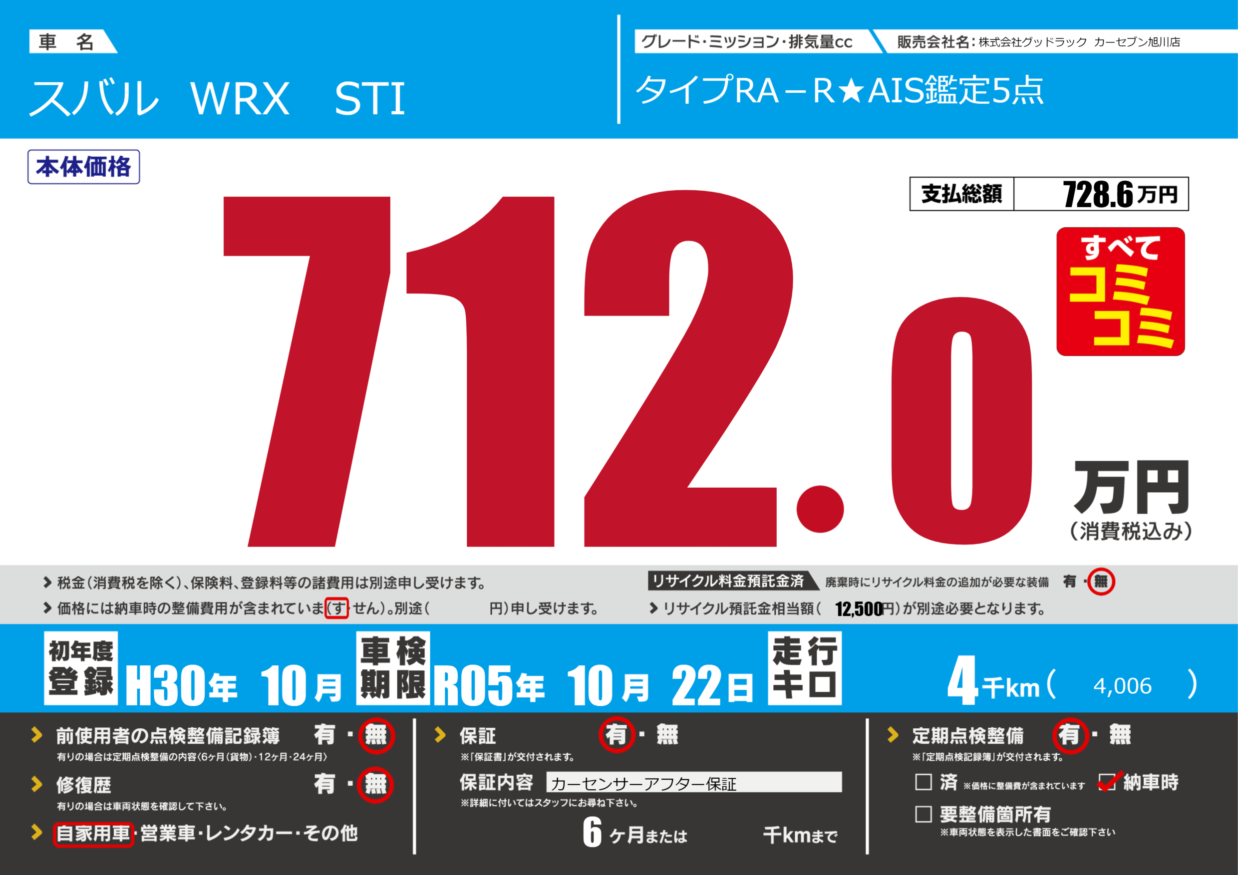 | 車名 | スバル WRX STI | グレード ミッション 排気量 |