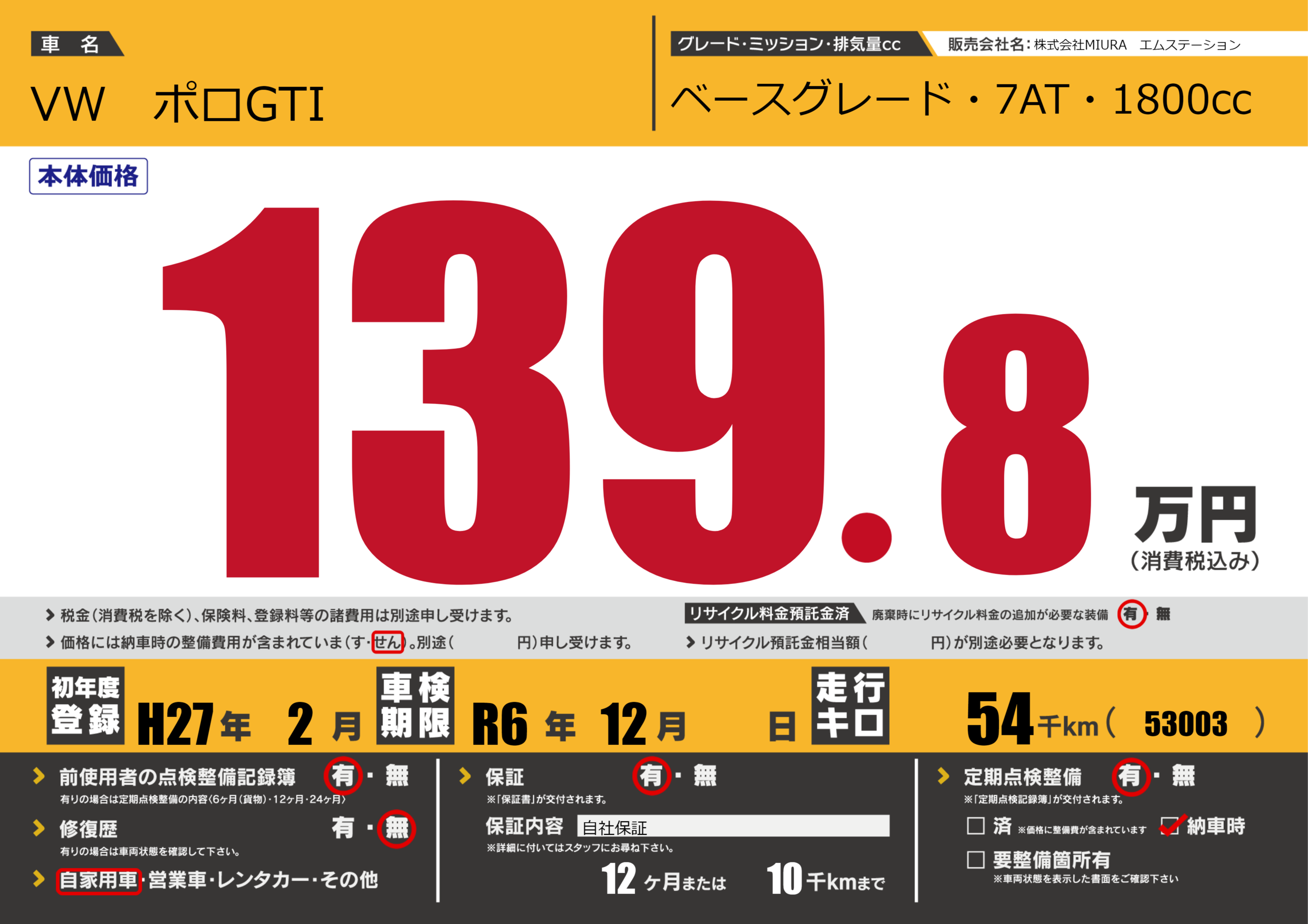 | 車名 | VW ポロGTI | グレード ミッション 排気量 |