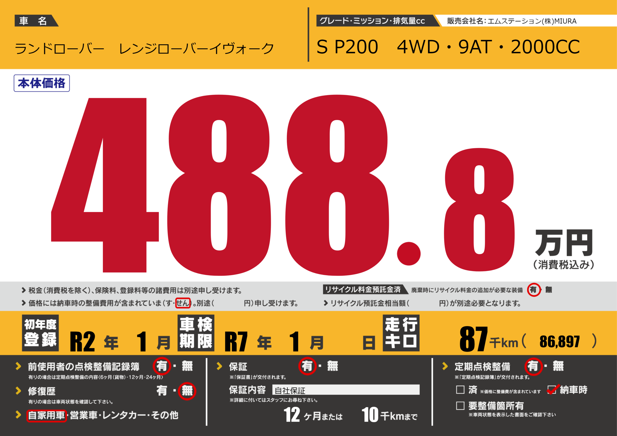 | 車名 | ランドローバー レンジローバーイヴォーク | グレード ミッション 排気量 |