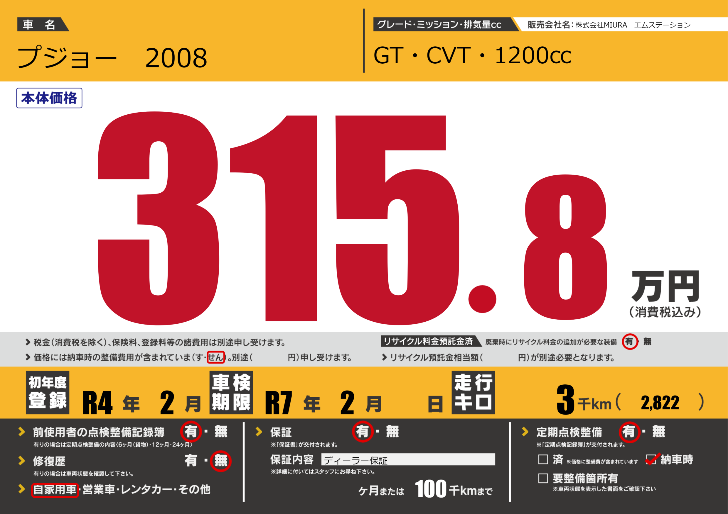 | 車名 | プジョー 2008 | グレード ミッション 排気量 |