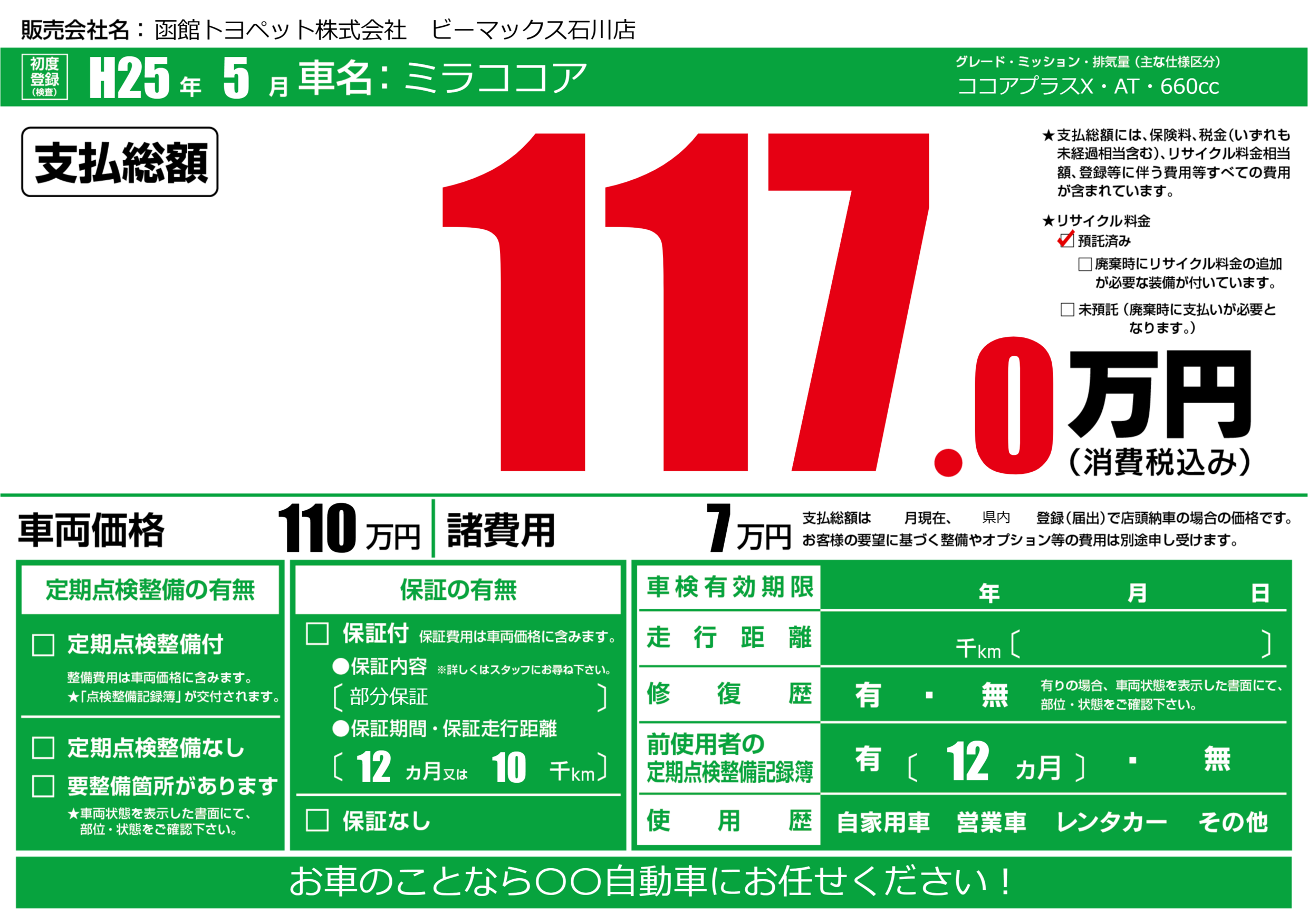 あり | リサイクル預託金相当額 | ( 0円)が別途必要 |