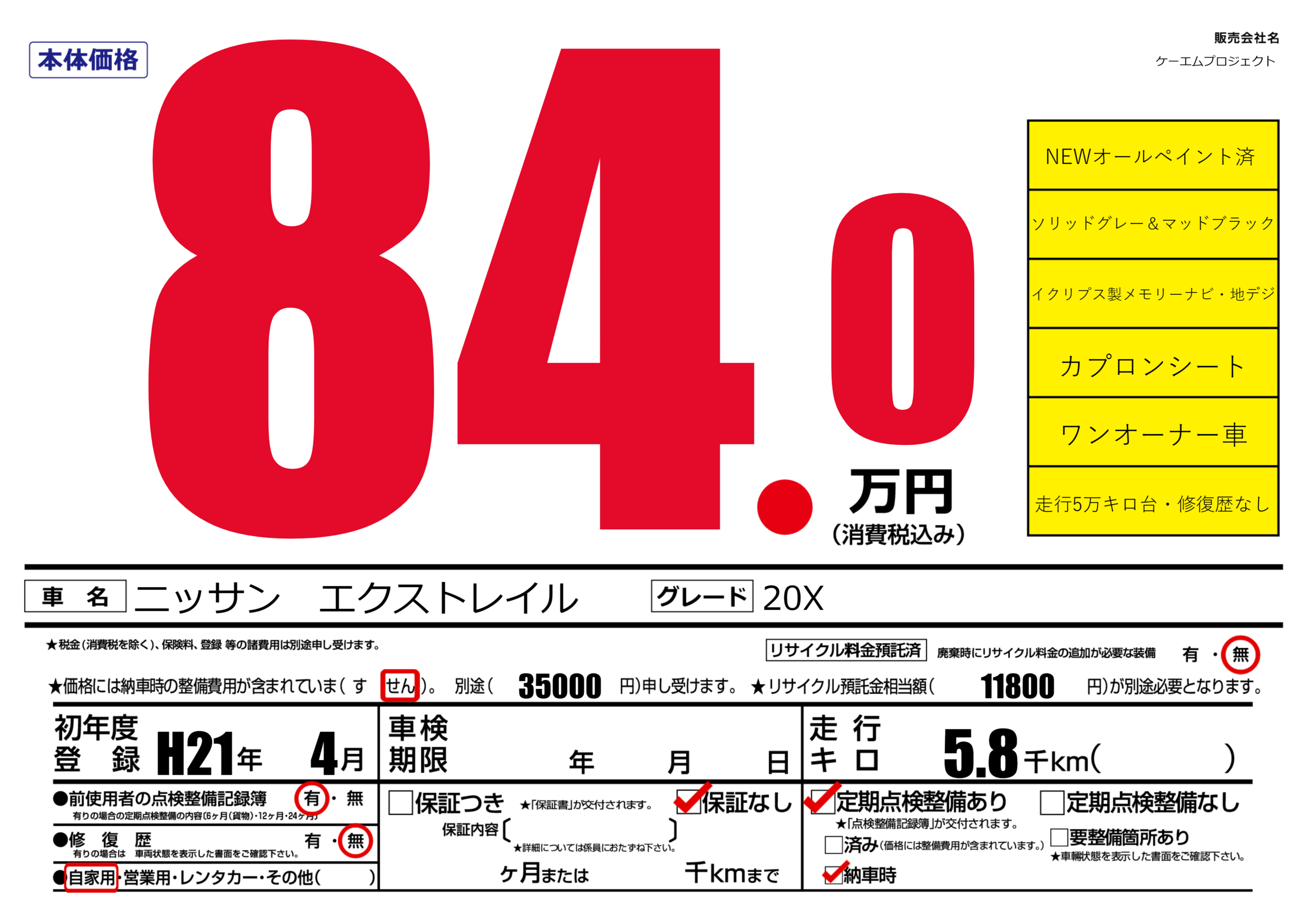 | 車名 | ニッサン エクストレイル | グレード ミッション 排気量 |