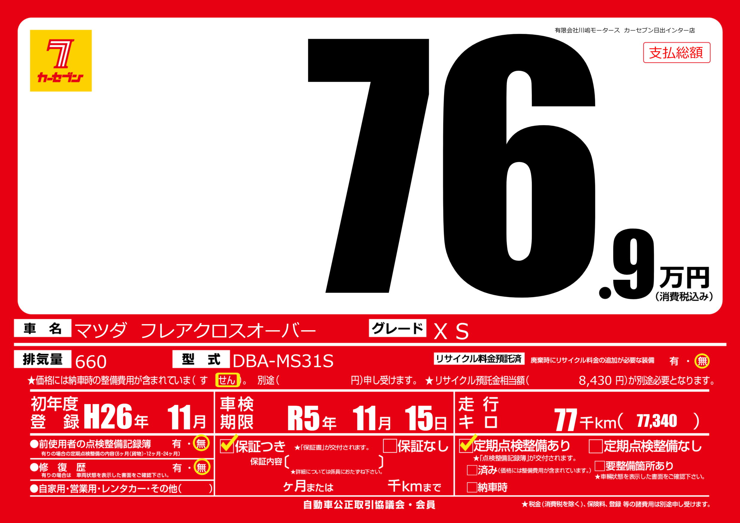 | 走行キロ | 7.7万km | 初年度登録 | H26年11月 |