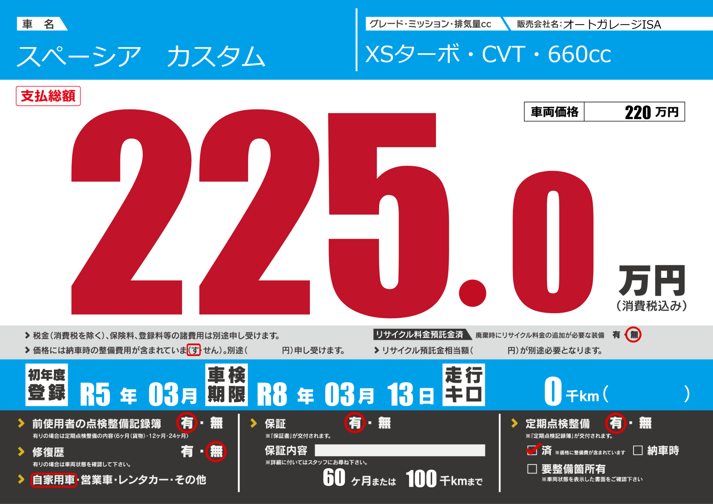 | 定期点検整備 | 定期点検整備あり 定期点検整備済み | ||