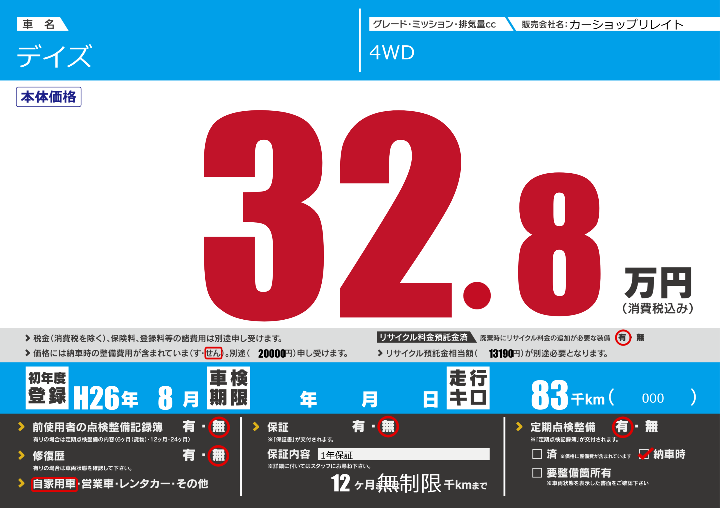 | 定期点検整備 | 定期点検整備あり 納車時あり | ||