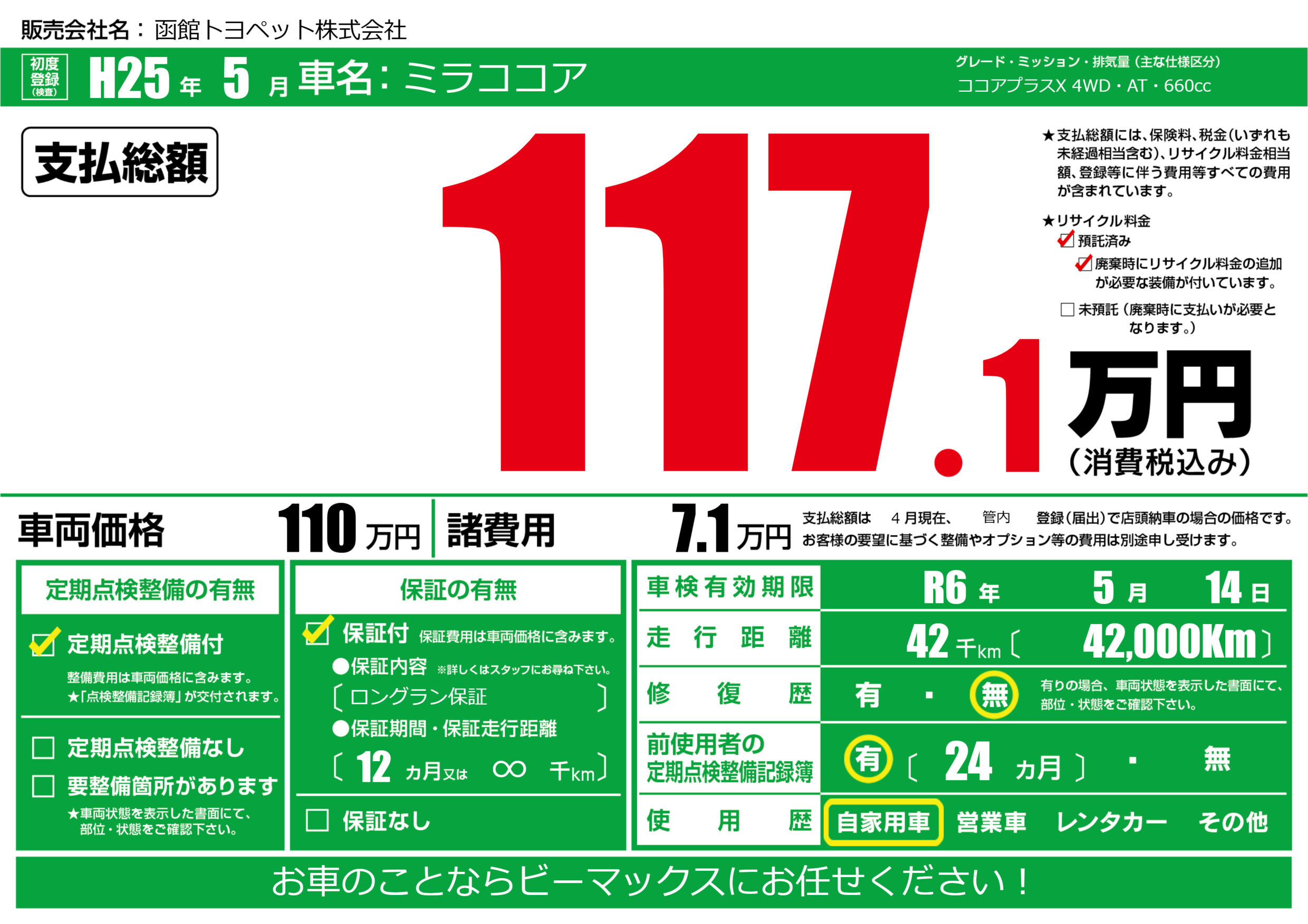 | 走行キロ | 4.2万km | 初年度登録 | H25年5月 |