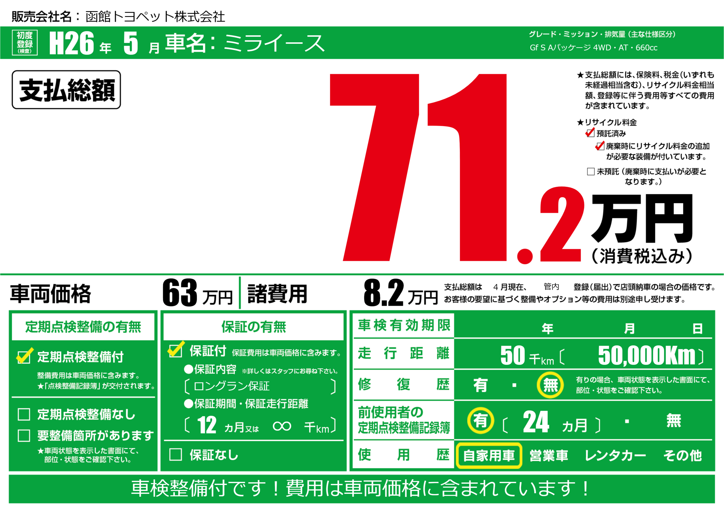 | 走行キロ | 5万km | 初年度登録 | H26年5月 |