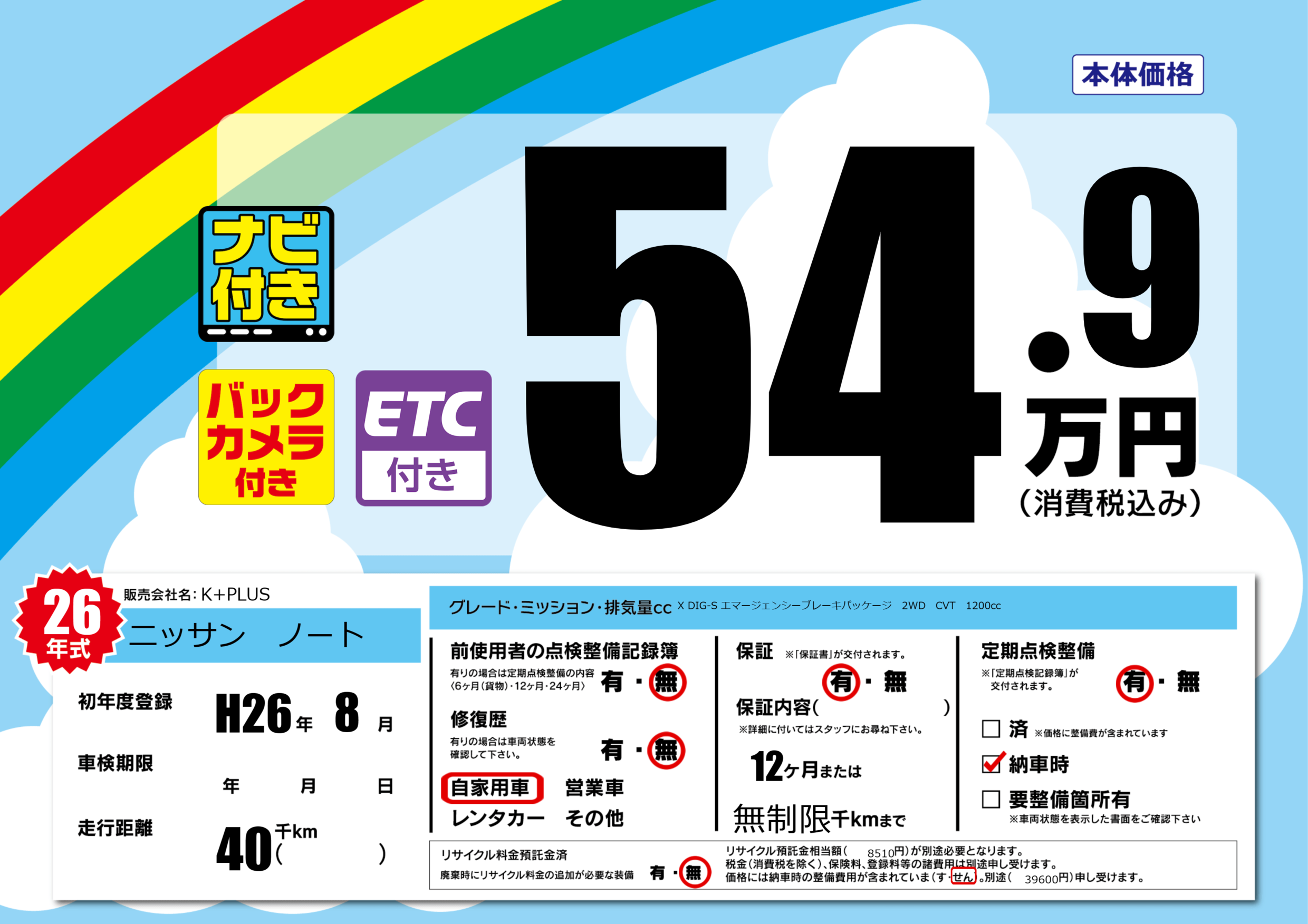 | 車名 | ニッサン ノート | グレード ミッション 排気量 |