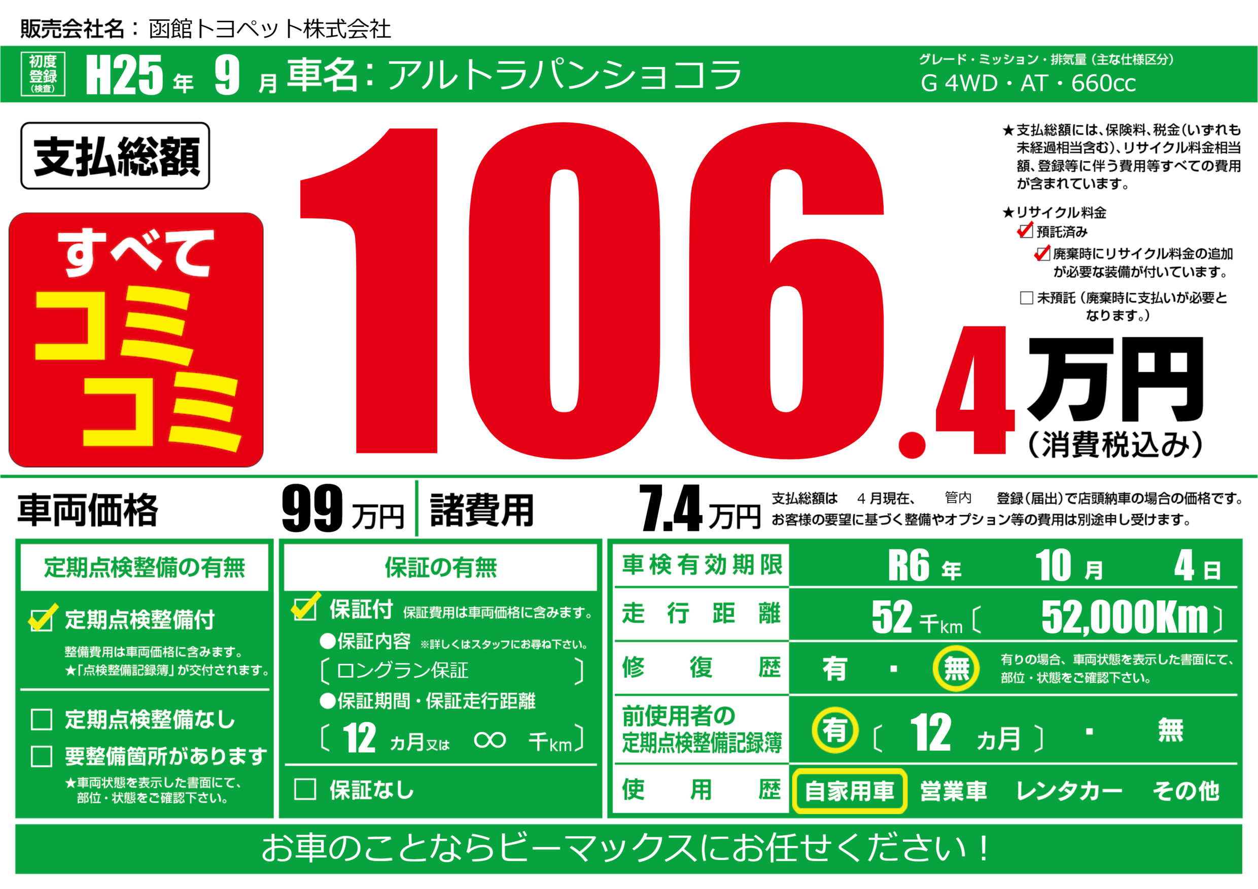 | 走行キロ | 5.2万km | 初年度登録 | H25年9月 |