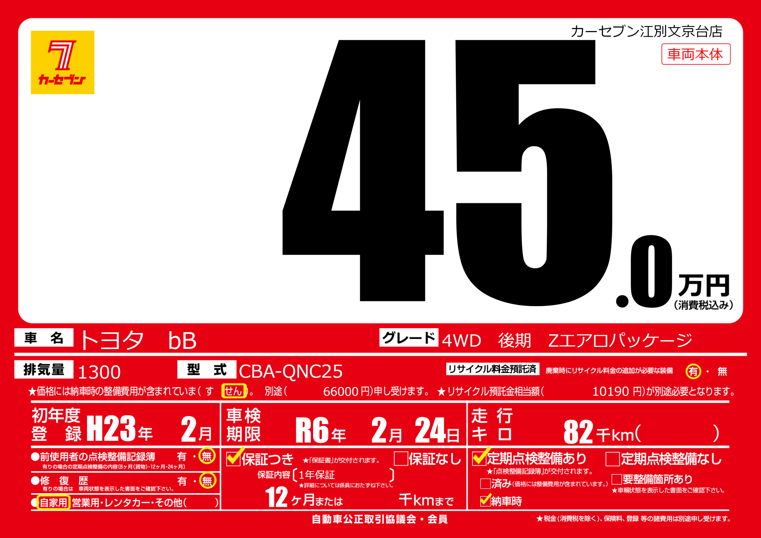 | 車名 | トヨタ bB | グレード ミッション 排気量 |