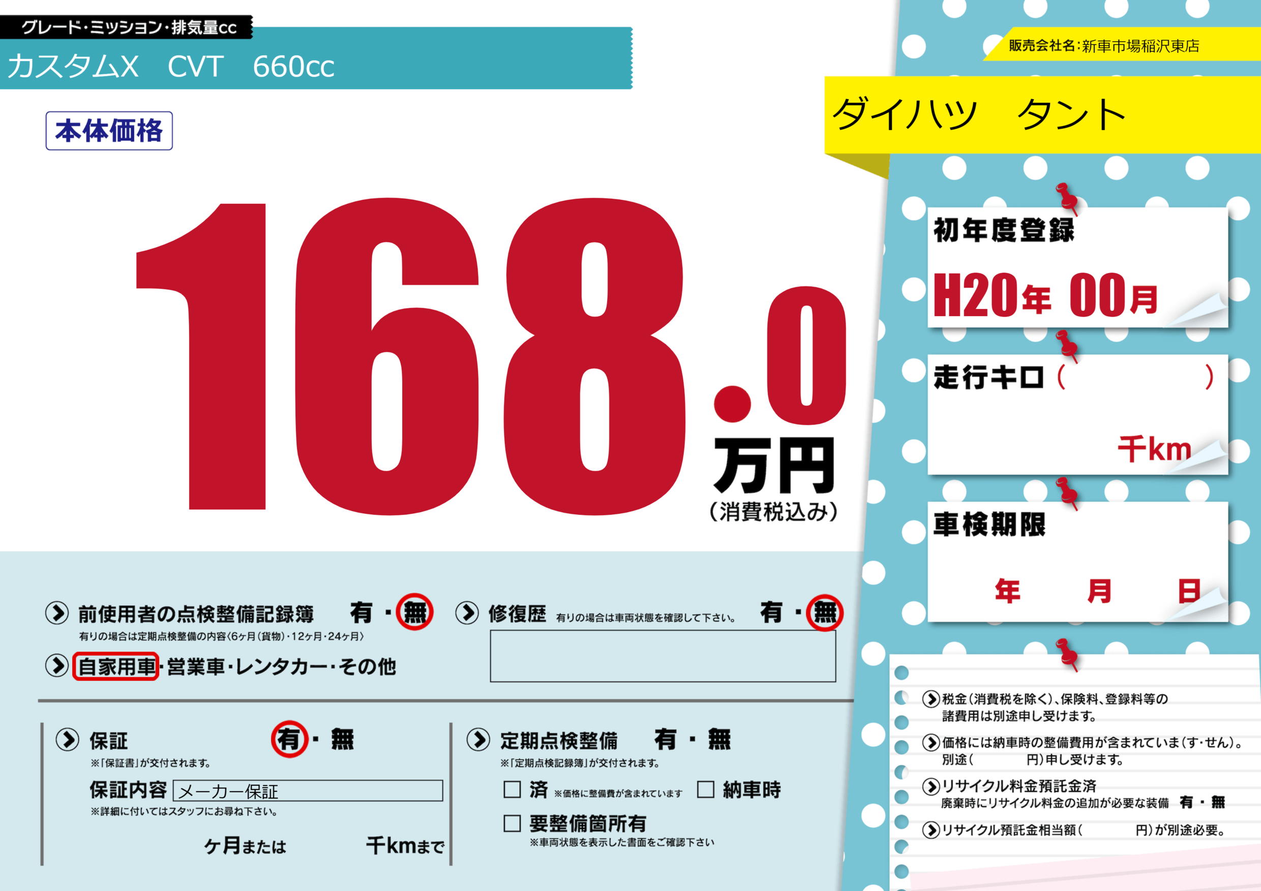 | 車名 | ダイハツ タント | グレード ミッション 排気量 |