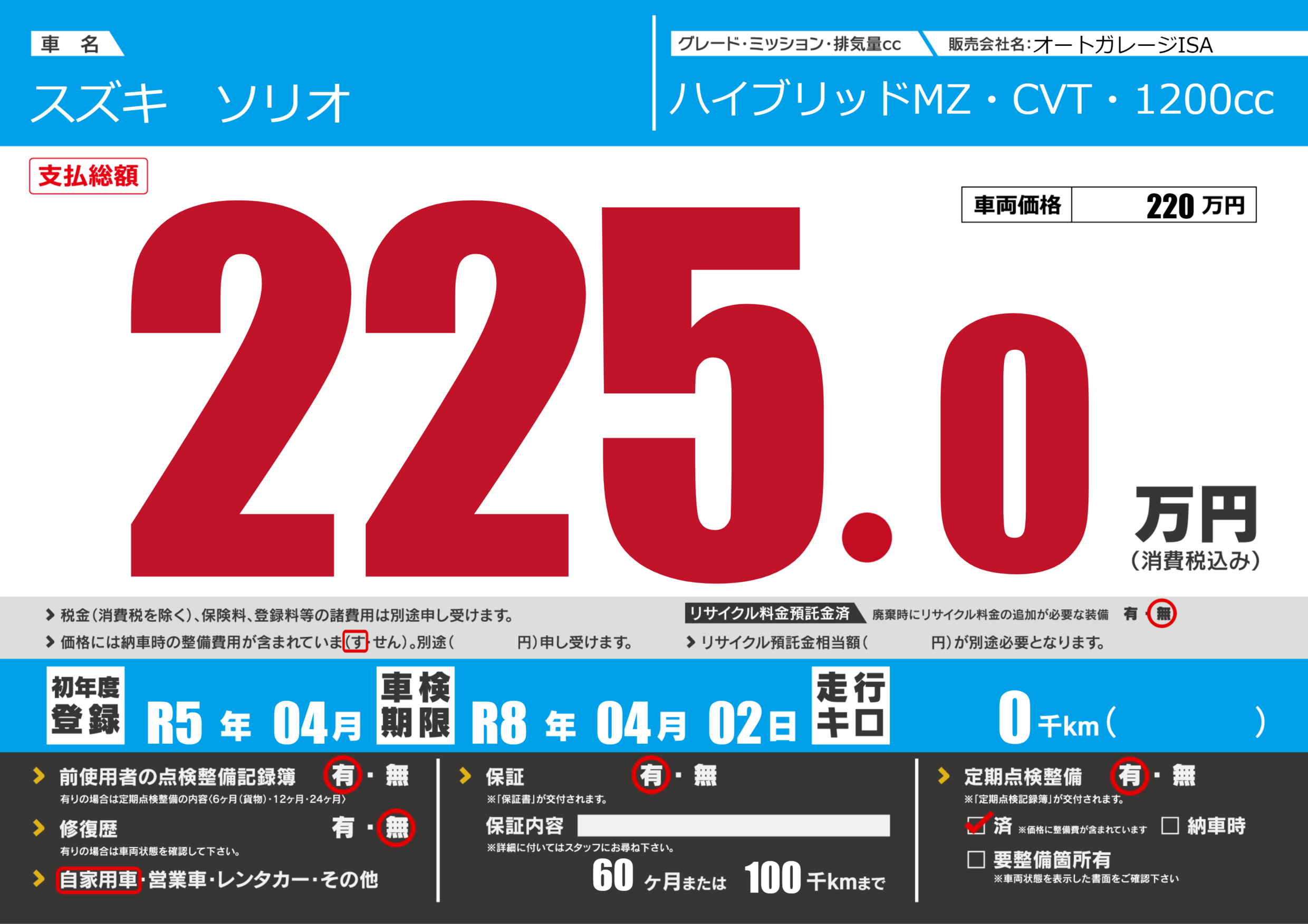 | 定期点検整備 | 定期点検整備あり 定期点検整備済み | ||