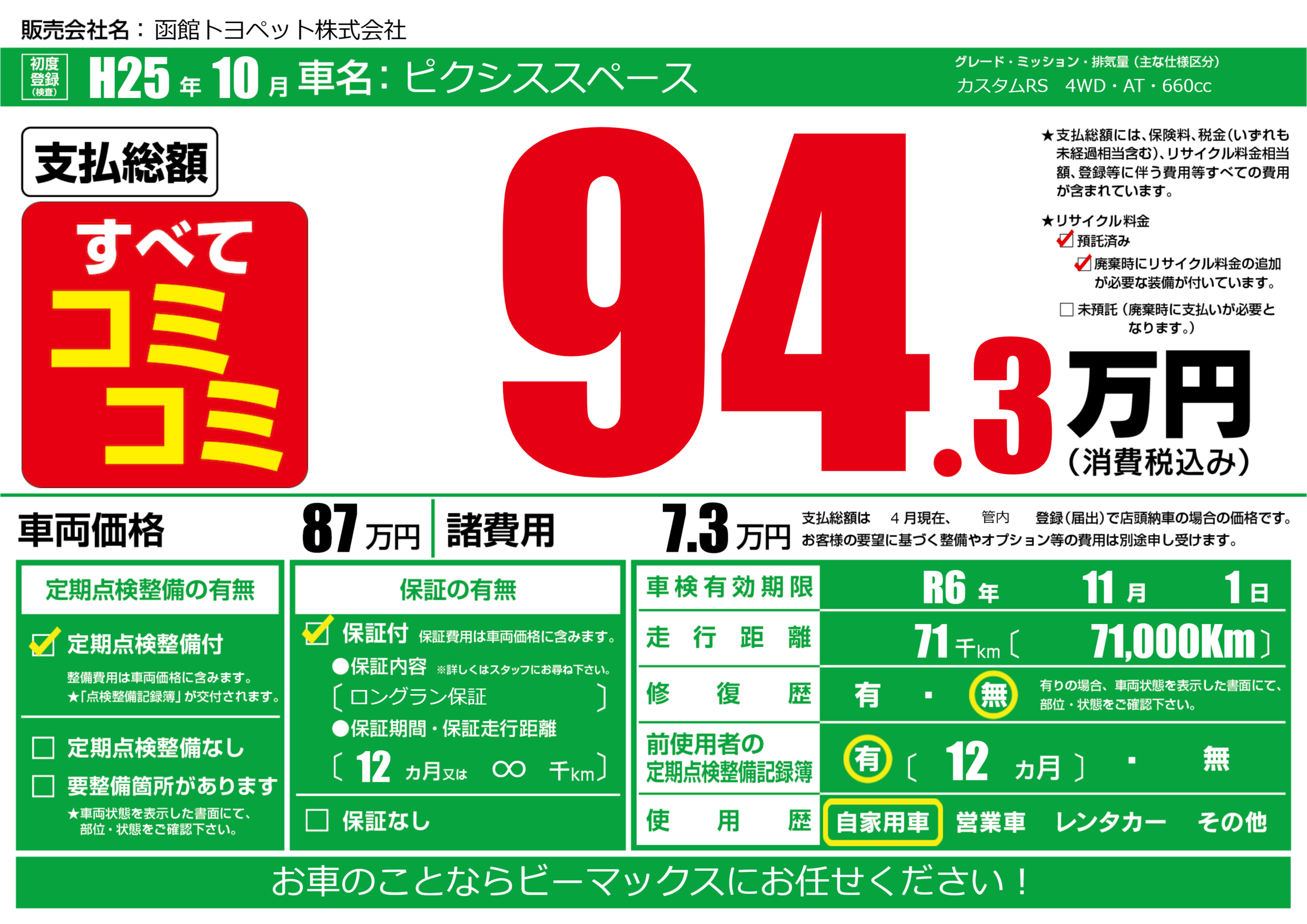 | 走行キロ | 7.1万km | 初年度登録 | H25年10月 |