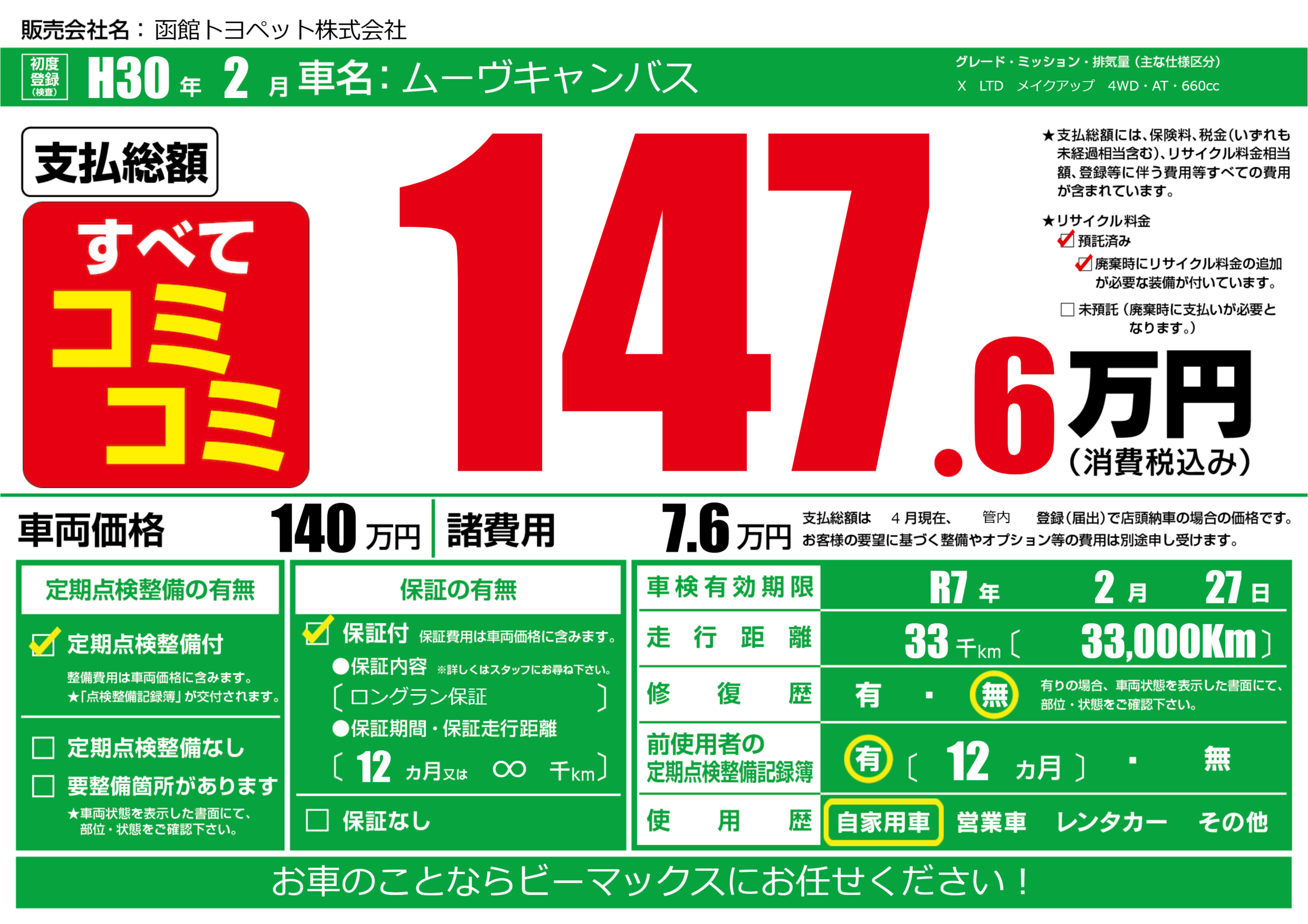| 定期点検整備 | 定期点検整備あり | ||
