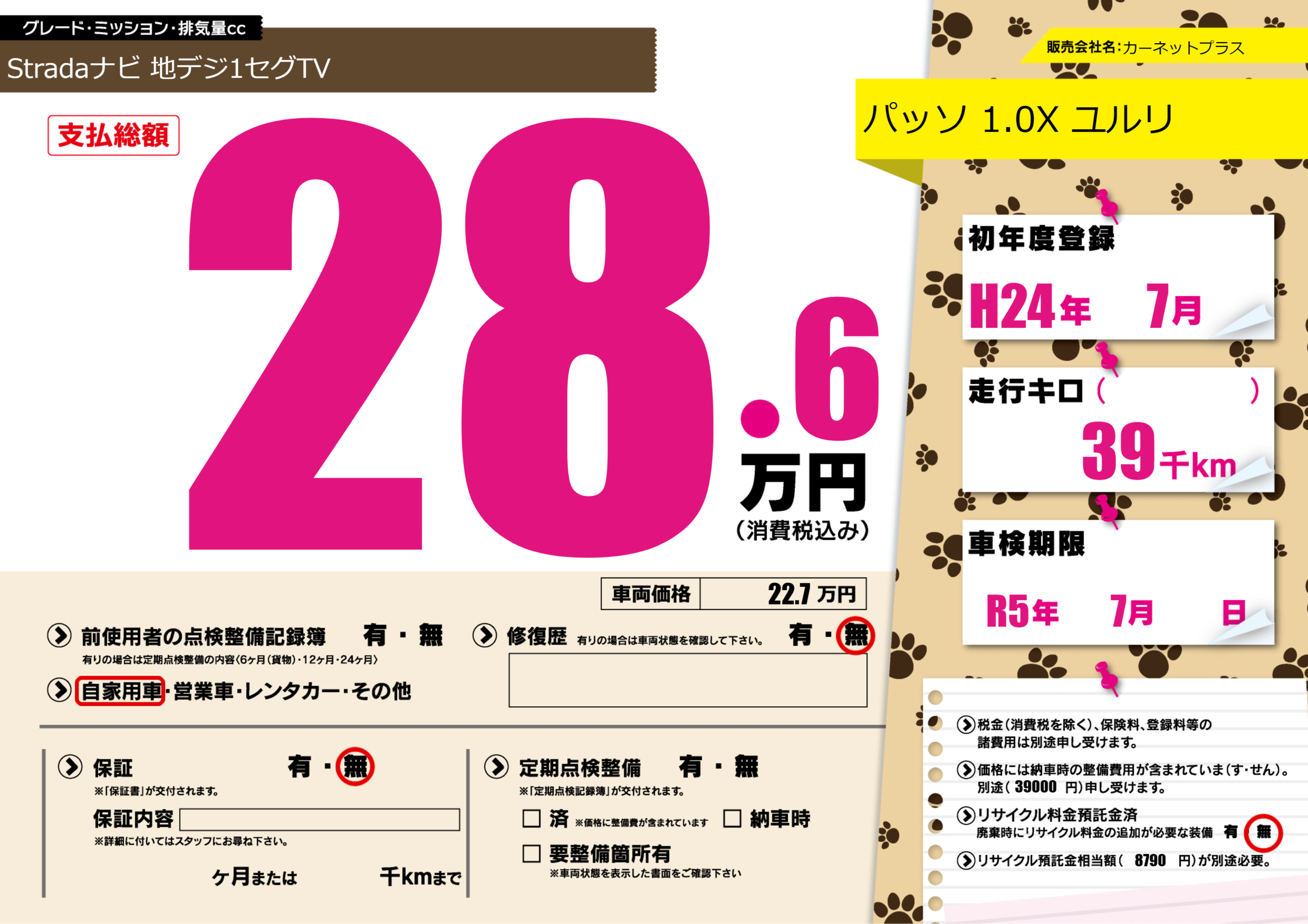 | 車名 | パッソ 1.0X ユルリ | グレード ミッション 排気量 |