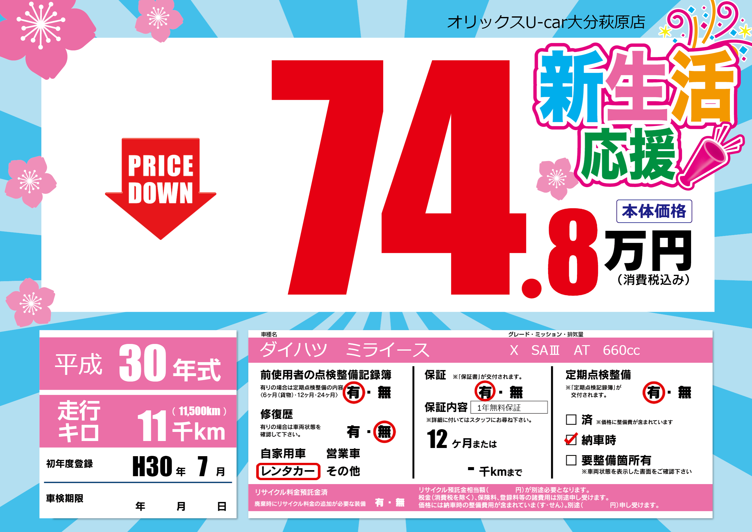 | 走行キロ | 1.1万km | 初年度登録 | H30年7月 |