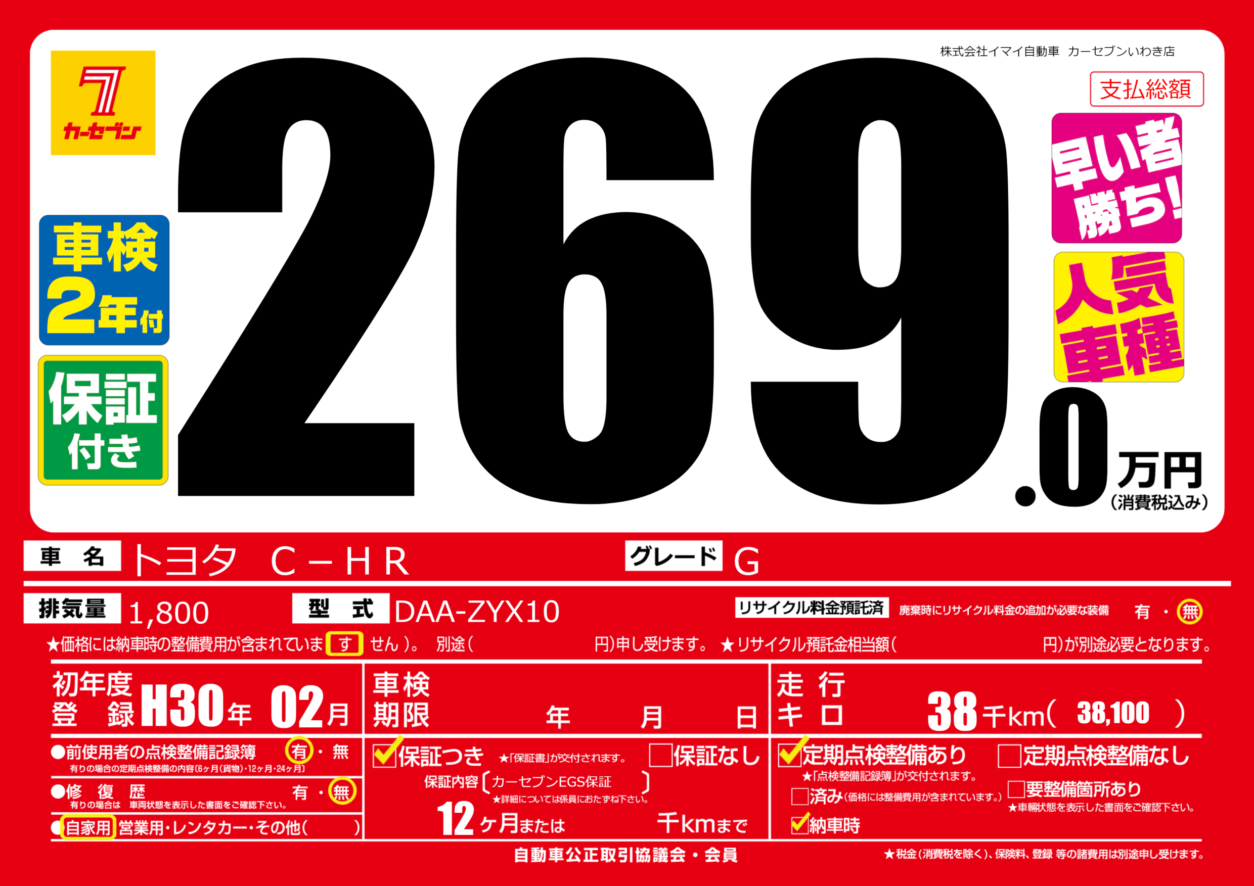 | 車名 | トヨタ C-HR | グレード ミッション 排気量 |