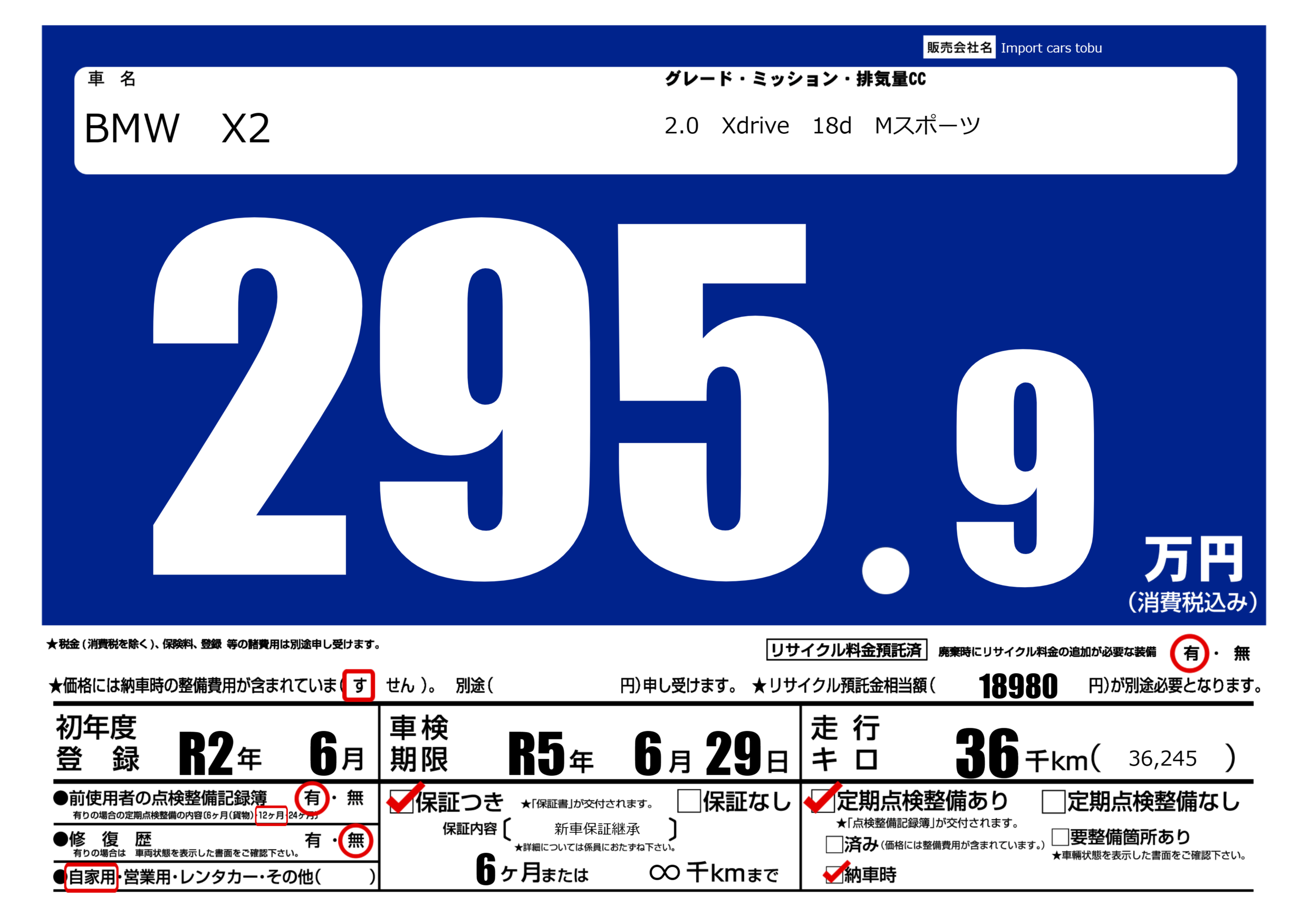 保証付き 保証内容( 新車保証継承) 6ヶ月または(∞)千kmまで |
