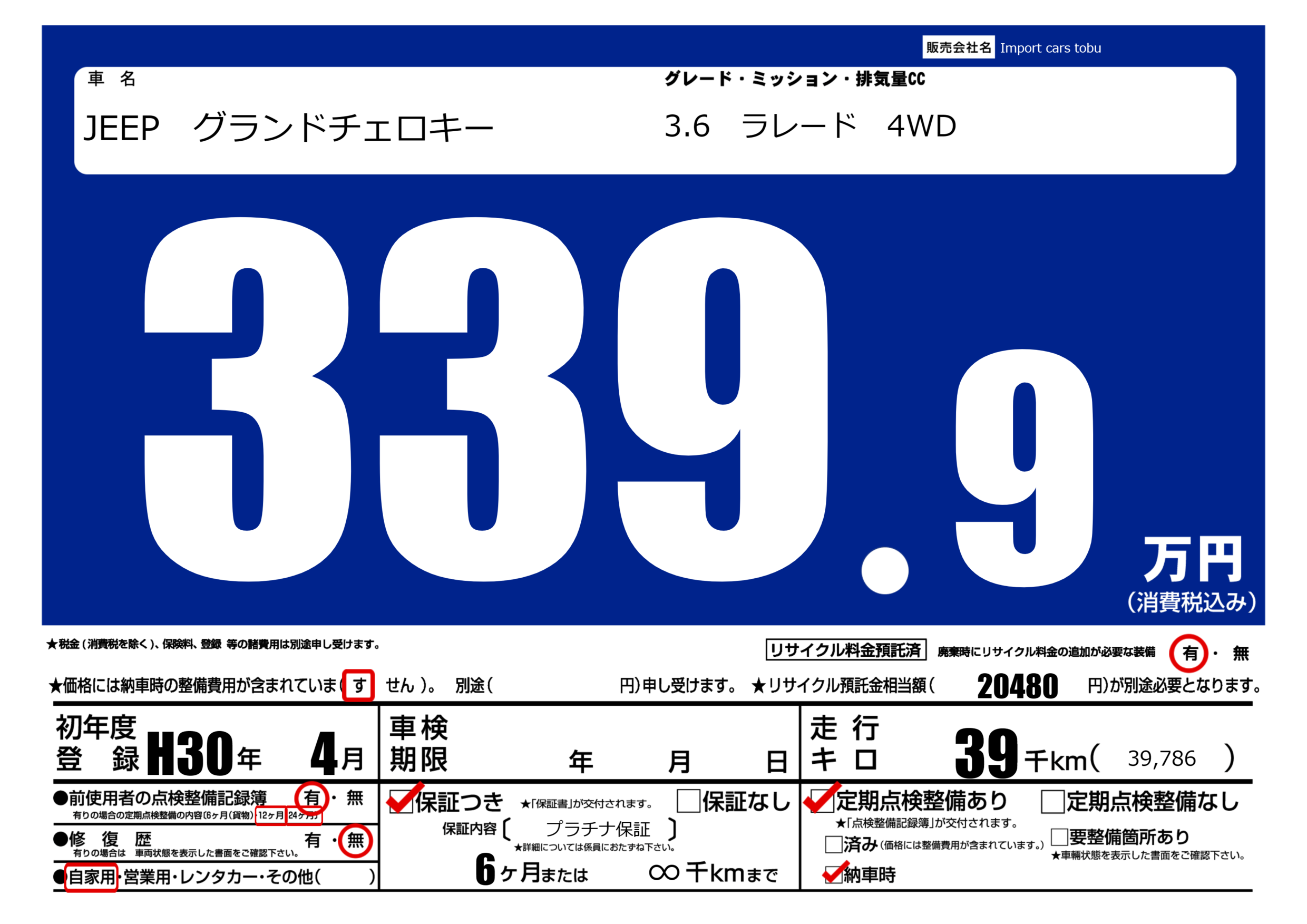 | 車名 | JEEP グランドチェロキー | グレード ミッション 排気量 |