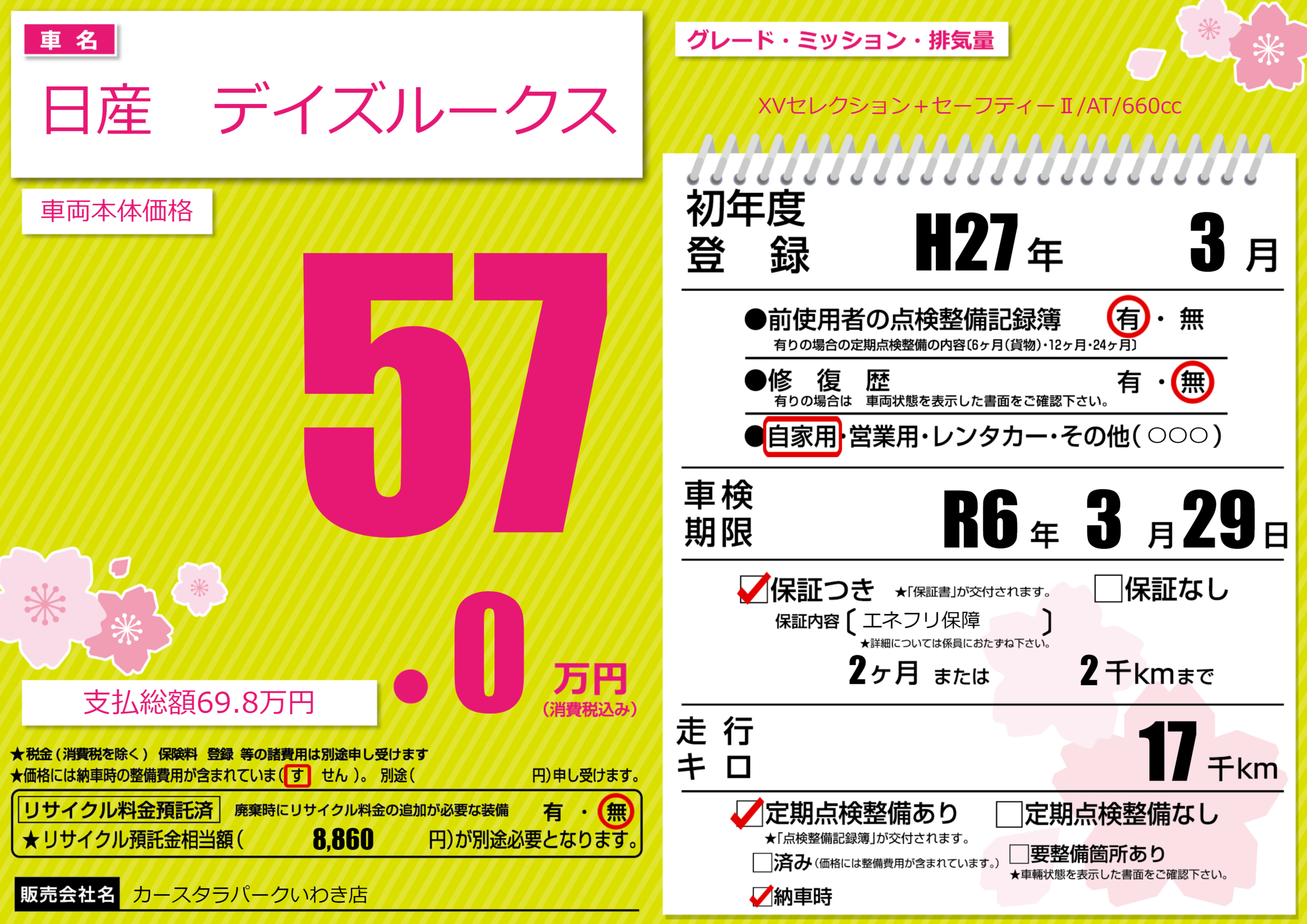 | 定期点検整備 | 定期点検整備あり 納車時あり | ||