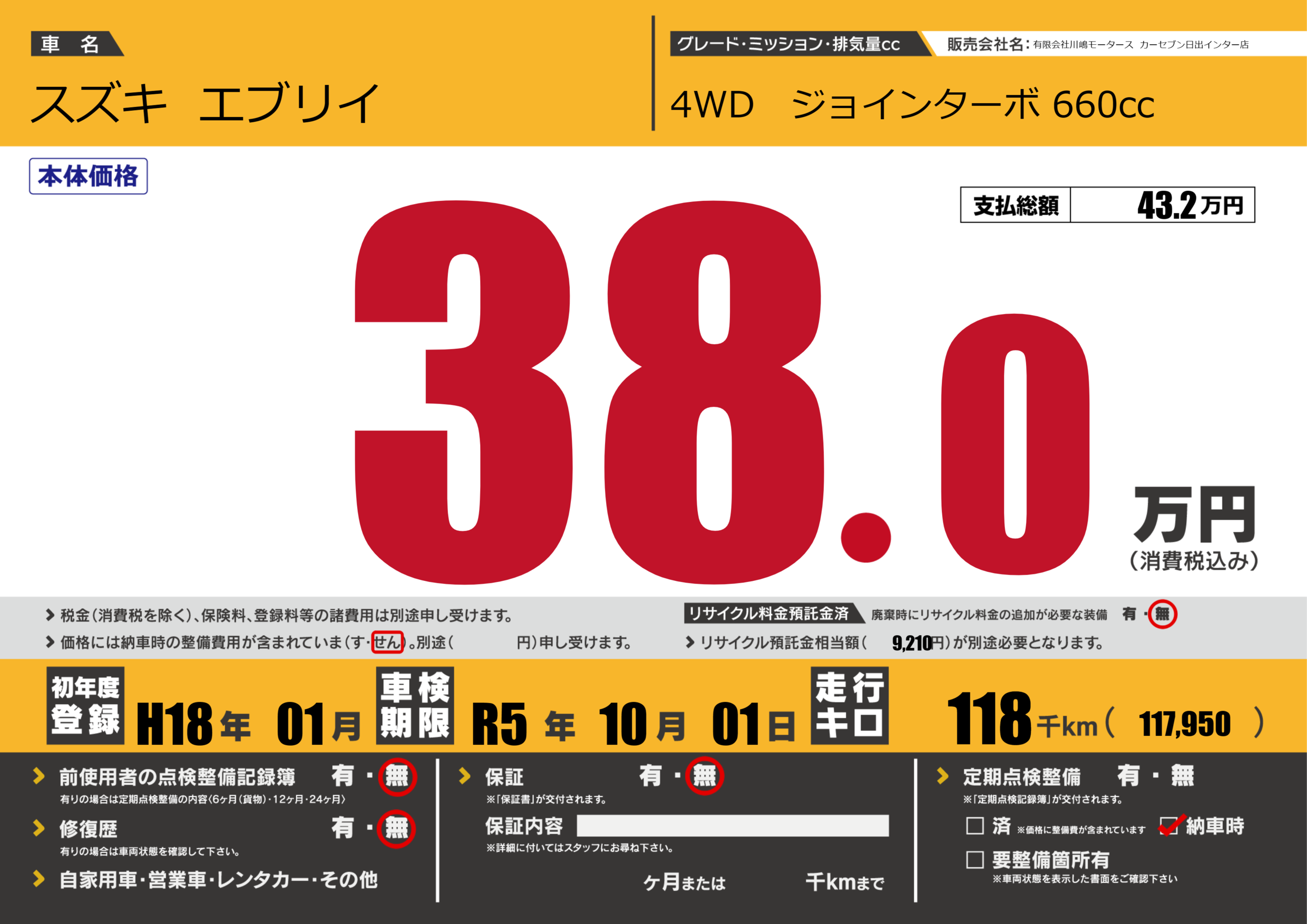 | 車検制限 | R5年 10月 01日 | ||