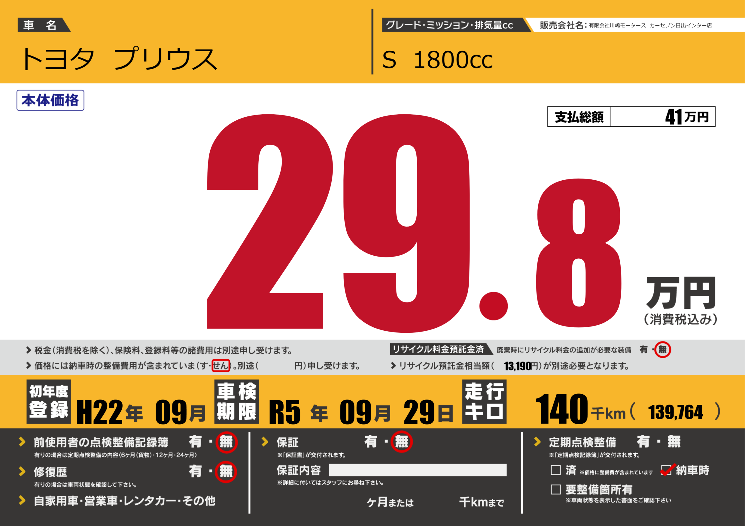 | 車名 | トヨタ プリウス | グレード ミッション 排気量 |