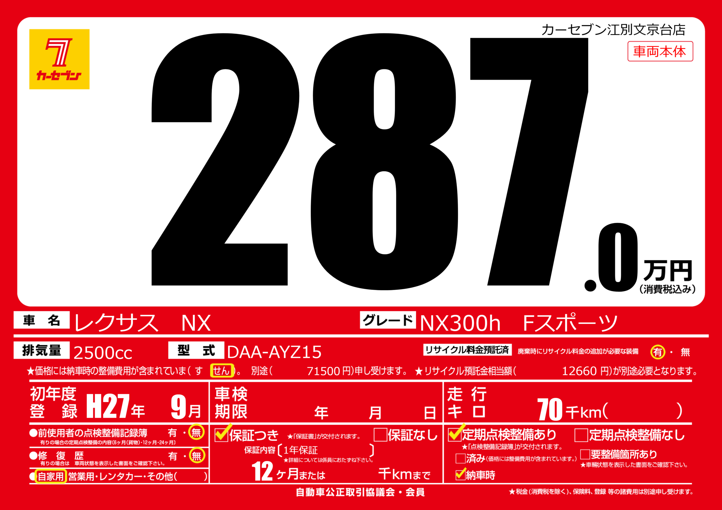 | 車名 | レクサス NX | グレード ミッション 排気量 |