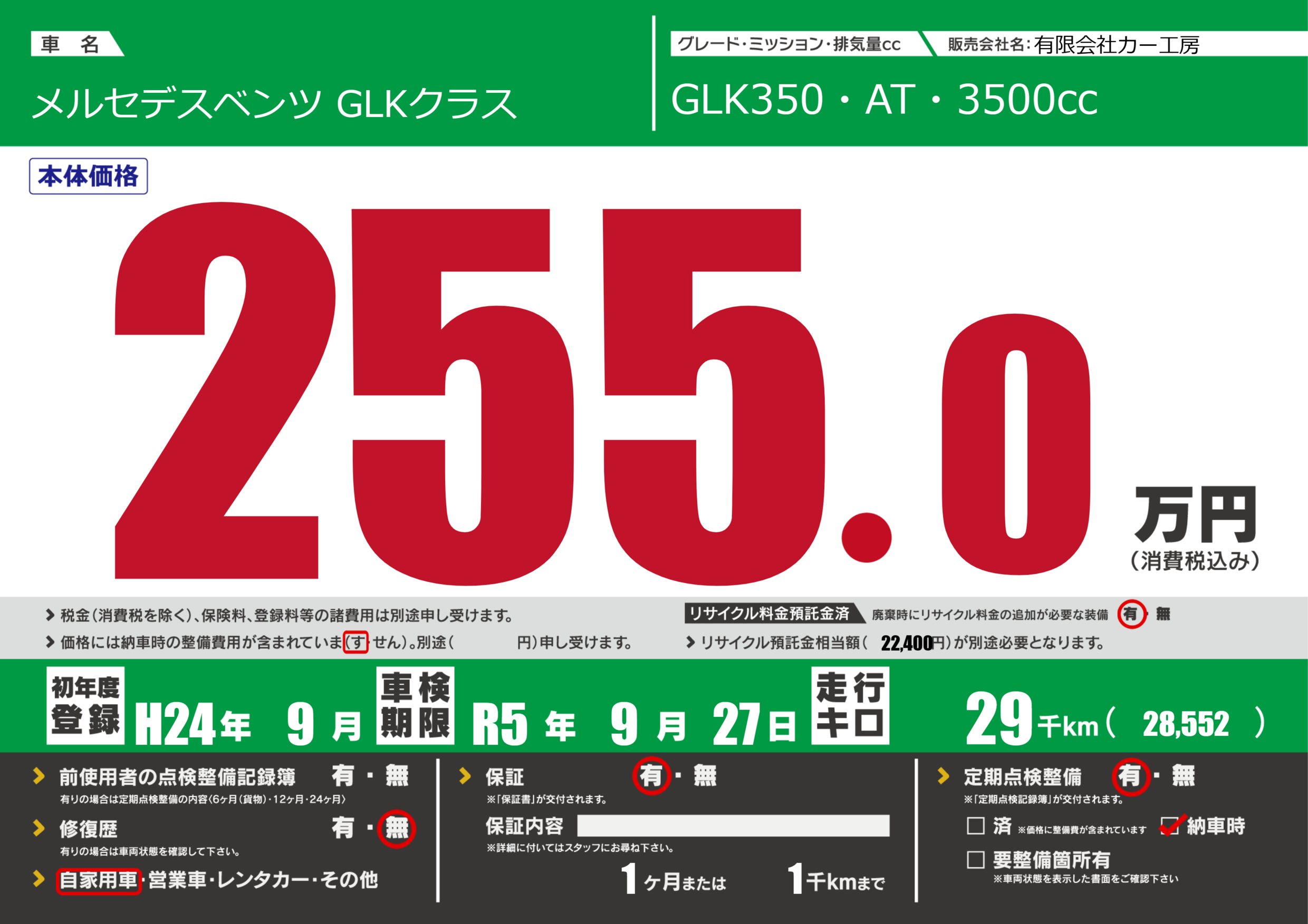 | 車名 | メルセデスベンツ GLKクラス | グレード ミッション 排気量 |